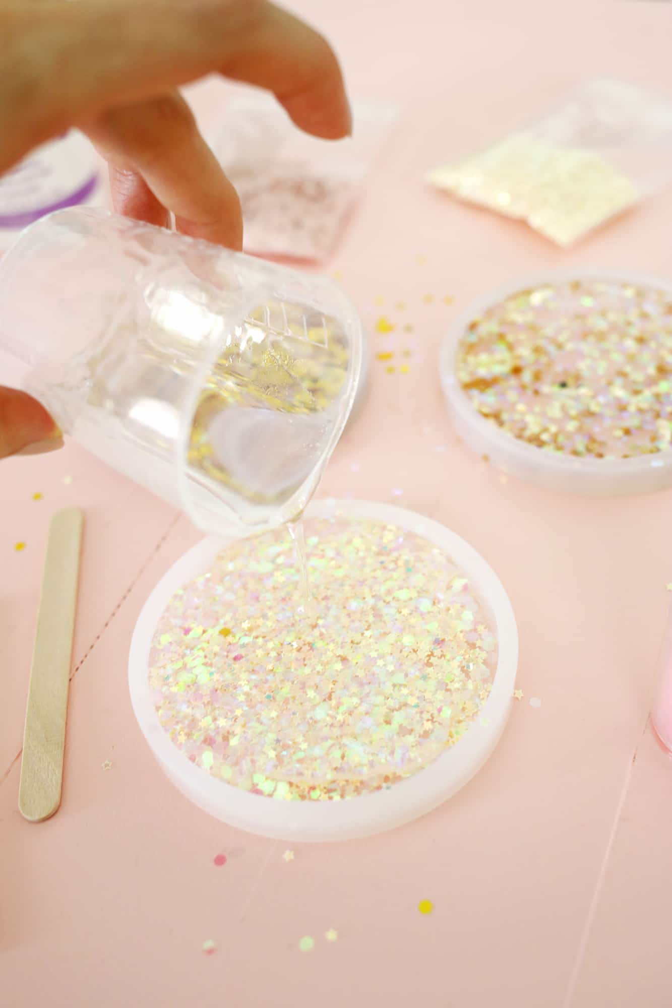 - Pour your epoxy over top of the glitter and fill the mold to right below the top edge.