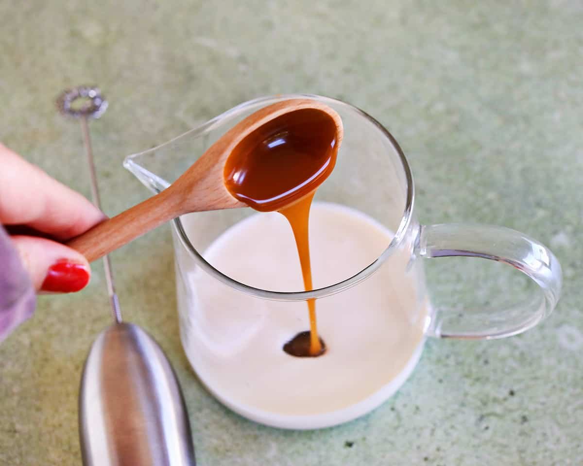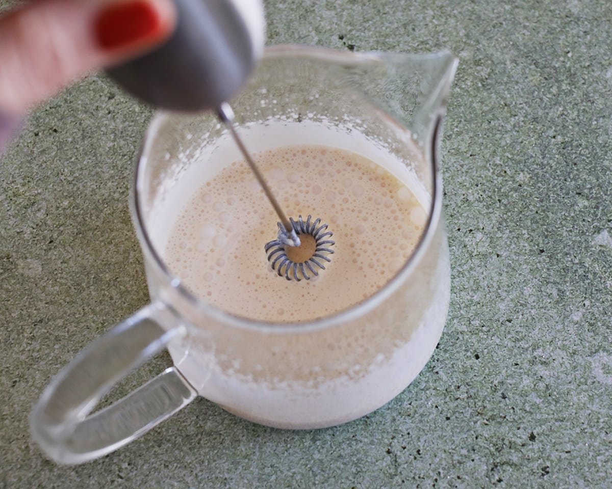 Next, use a milk frother to froth your cream until the consistency is somewhere between cream and whipped cream. When it becomes a little thicker and more foamy, you will know it’s the perfect consistency for your beverage.