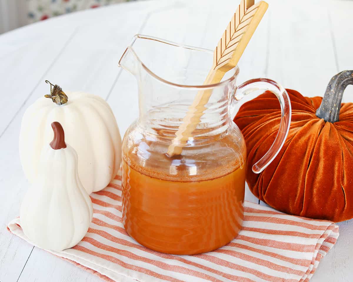 - In a pitcher, combine apple cider, pumpkin puree, vanilla, pumpkin spice and sugar.