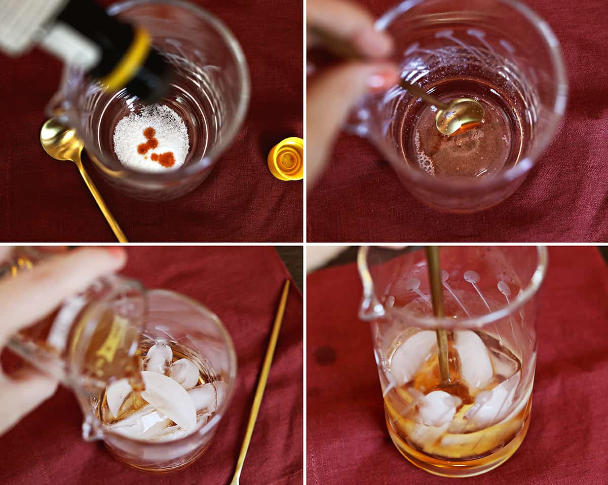 - Begin by pouring your sugar into a cocktail mixing glass. Add three dashes of bitters directly to the sugar. Add your water. Mix by hand with a spoon until the sugar has dissolved.