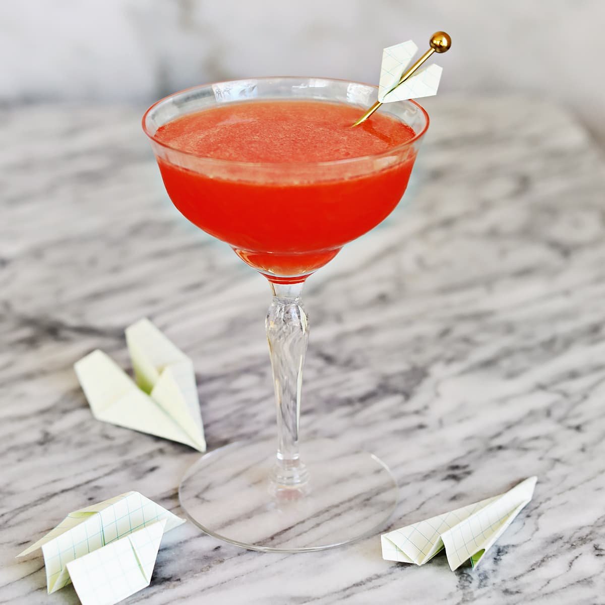 The best glassware choice for this cocktail is a coupe glass. I used a gold cocktail pick to secure my tiny paper airplane garnish.