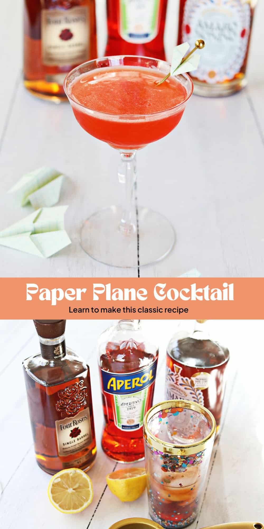 The Paper Plane is a modern take on the Last Word Cocktail, which is another equal parts drink made using gin, green chartreuse, maraschino liqueur and lime juice. Although these two drinks have few ingredients in common, the unique combination of citrus, botanical liqueurs and liquor to create a unique sweet and strong cocktail are the same. The two drinks are cousins and happen to be two of my personal favorite cocktails. Try both and see which recipe you love most.