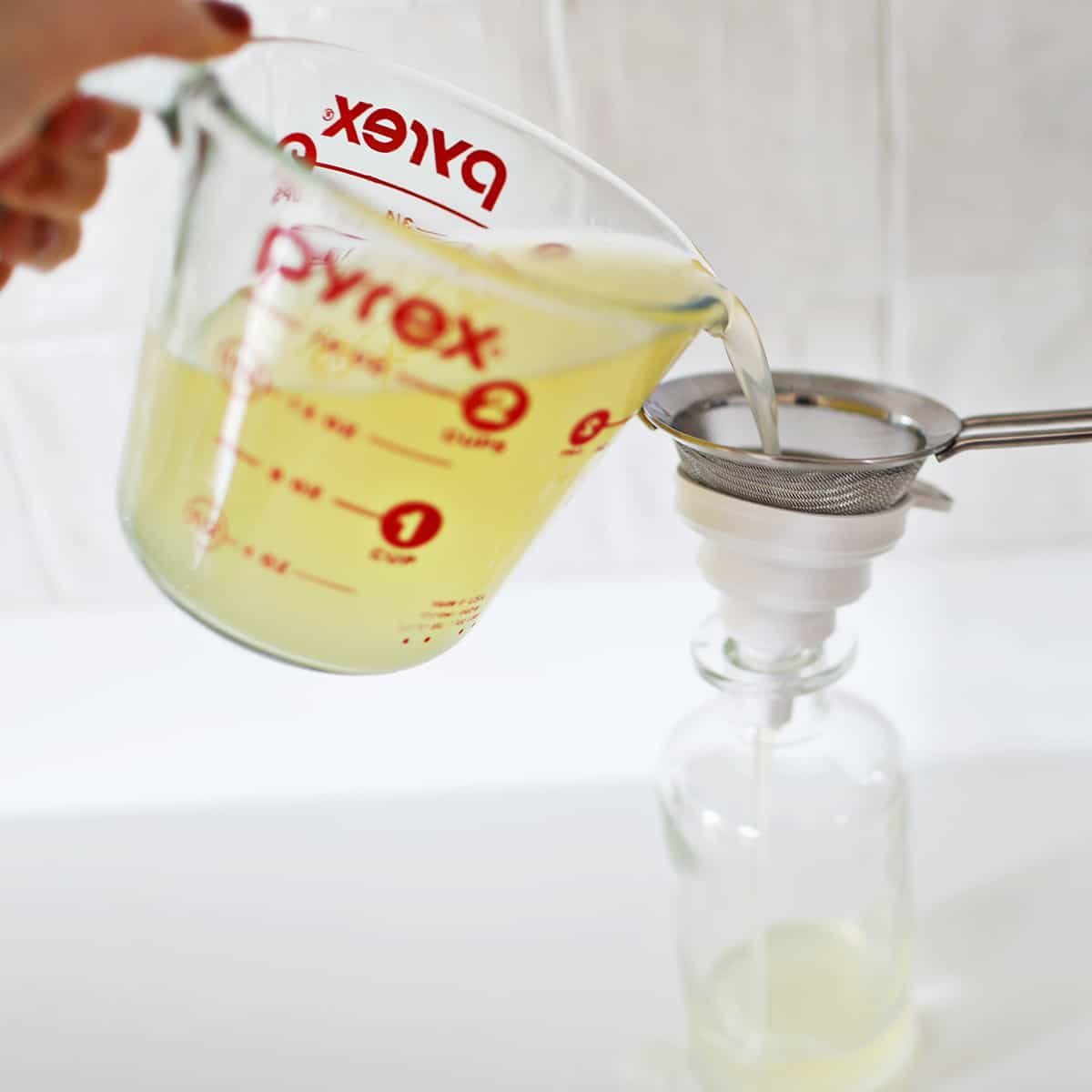 - Use a fine mesh strainer to decant it into a bottle. I used this bottle from Amazon. Add a label if you like—this is especially helpful for guests and parties.