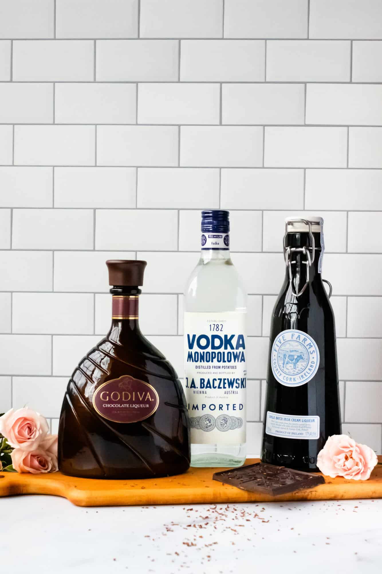 - Add the chocolate liqueur, Irish cream and vodka to a cocktail shaker with ice. Shake until chilled.