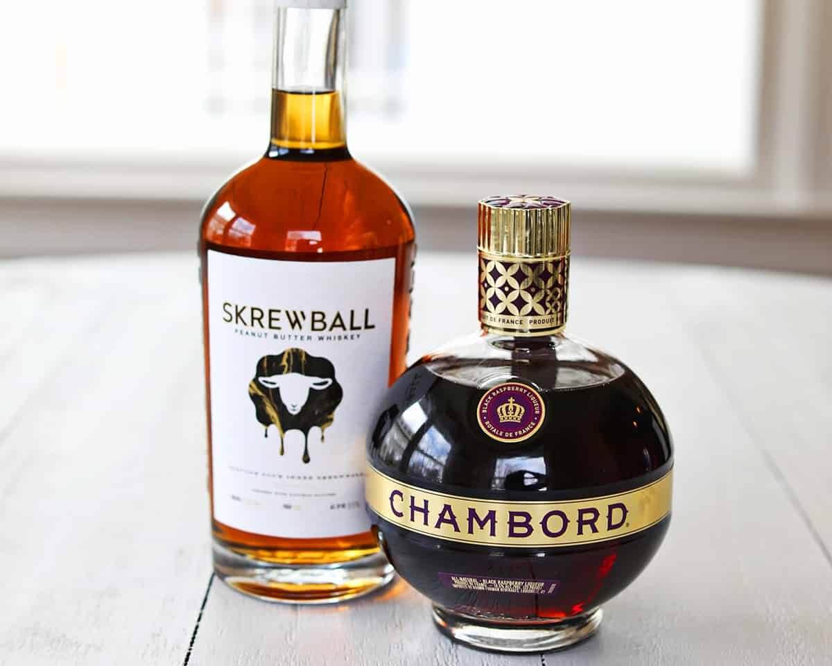 A PB&J shot is made with Screwball whiskey (peanut butter whiskey) and Chambord or any other fruit liqueur.