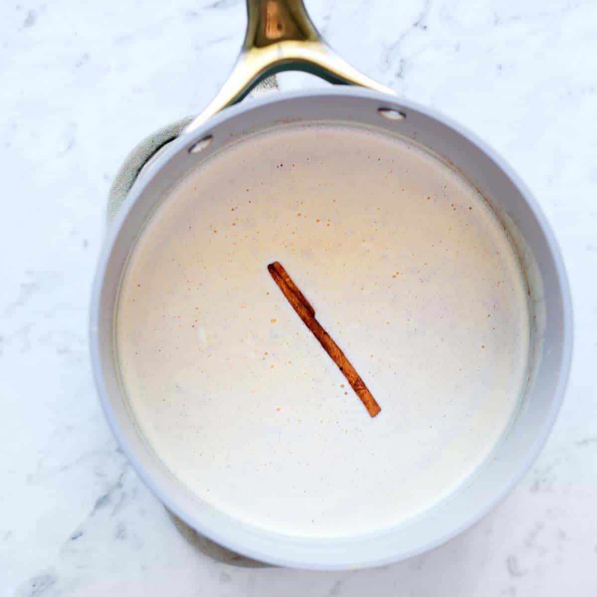In a medium saucepan, add the sugar, cream, milk, nutmeg, vanilla extract and cinnamon stick. Whisk over low/medium heat until very warm and the sugar has fully dissolved.