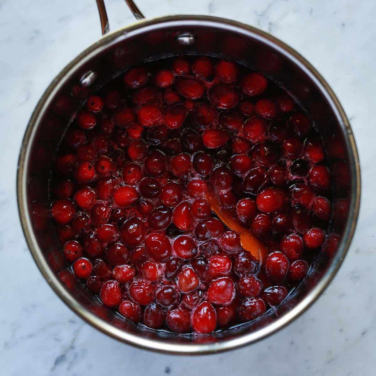 - Add the cranberries and orange peel and cook over medium/high heat until the cranberries begin to burst (3-5 minutes).