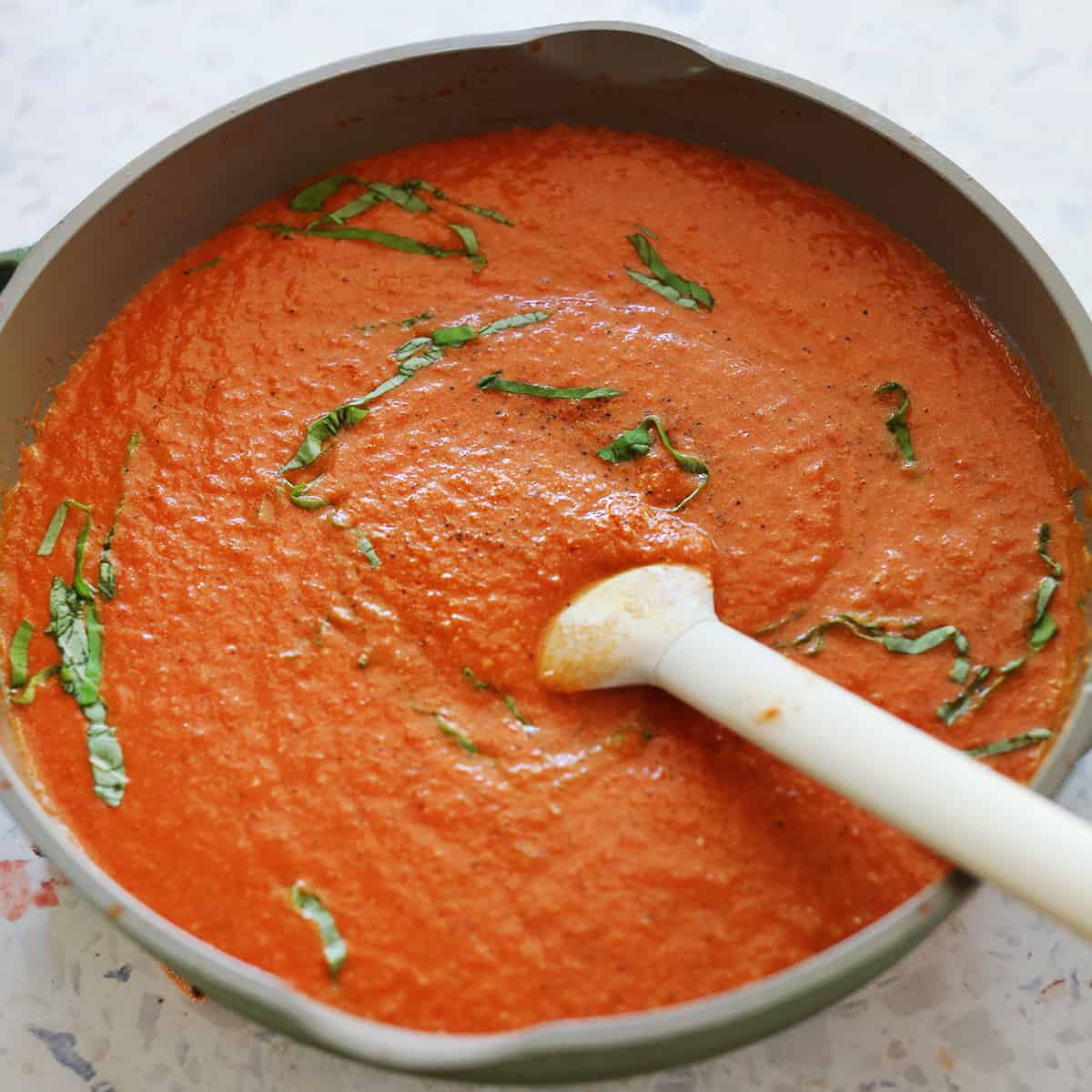 Cook the onion and garlic (aromatics) first. Then, add the stewed tomatoes, tomato paste, and vodka. Blend the sauce together with an immersion blender or in a blender. Finally, stir in the cream and you’re ready for dinner!