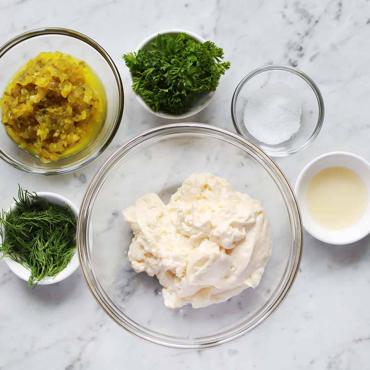 Finely chop the parsley and dill. In a small to medium sized mixing bowl stir together the mayo, relish, herbs, lemon juice and sugar.