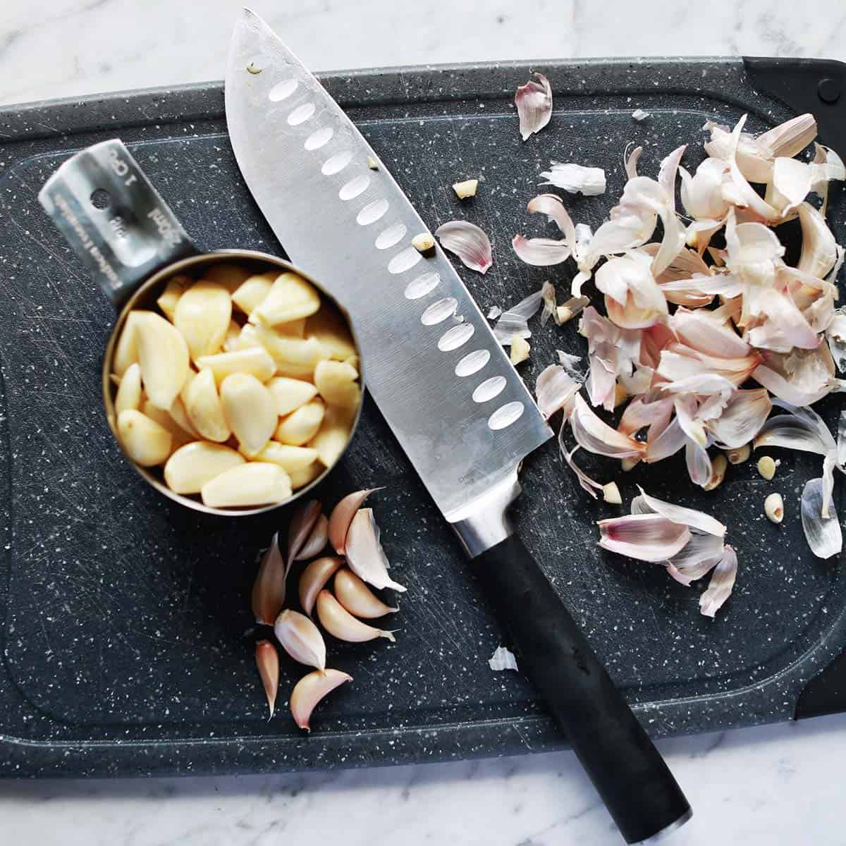 I’ve found the best way to peel garlic cloves is to place them on a cutting board, a few at a time. Then turn your knife sideways, so it’s flat, over the garlic. Lightly smash the top of the knife with your fist, smashing the cloves a little. Then peel the papery outside away.