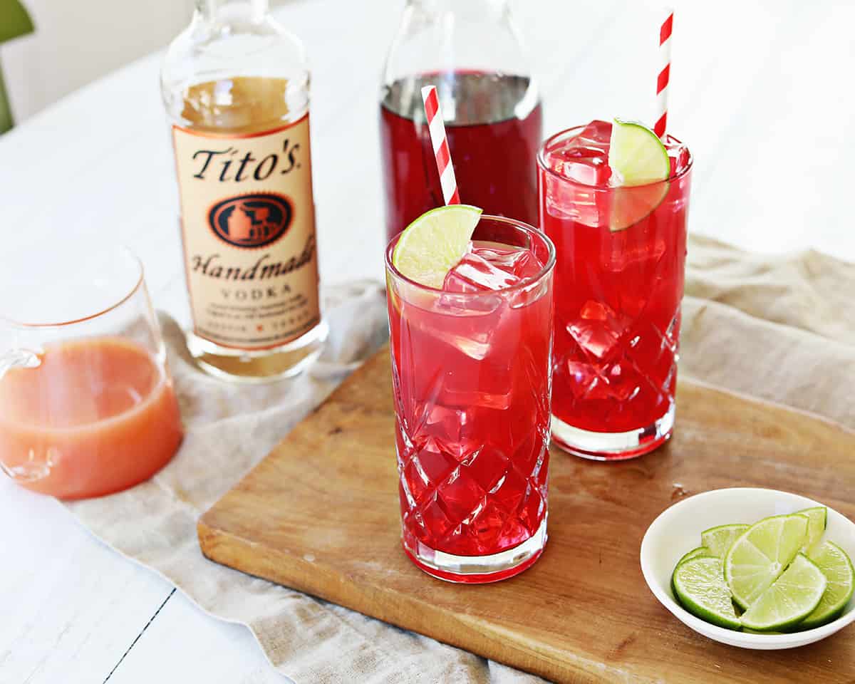 - Add vodka, cranberry juice and grapefruit juice to a highball glass with ice and stir.