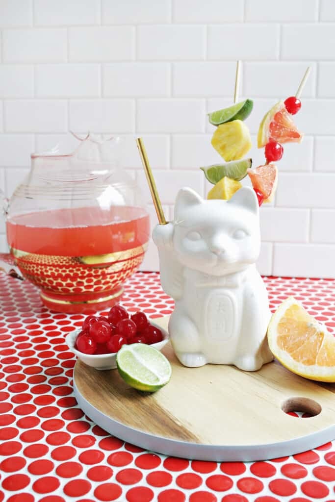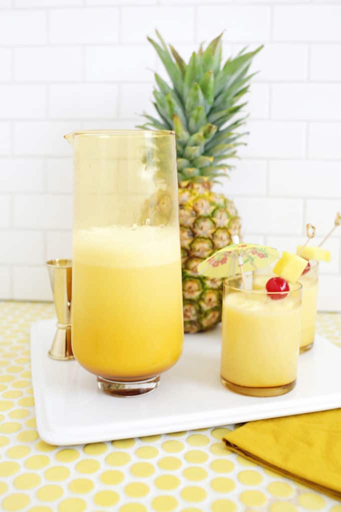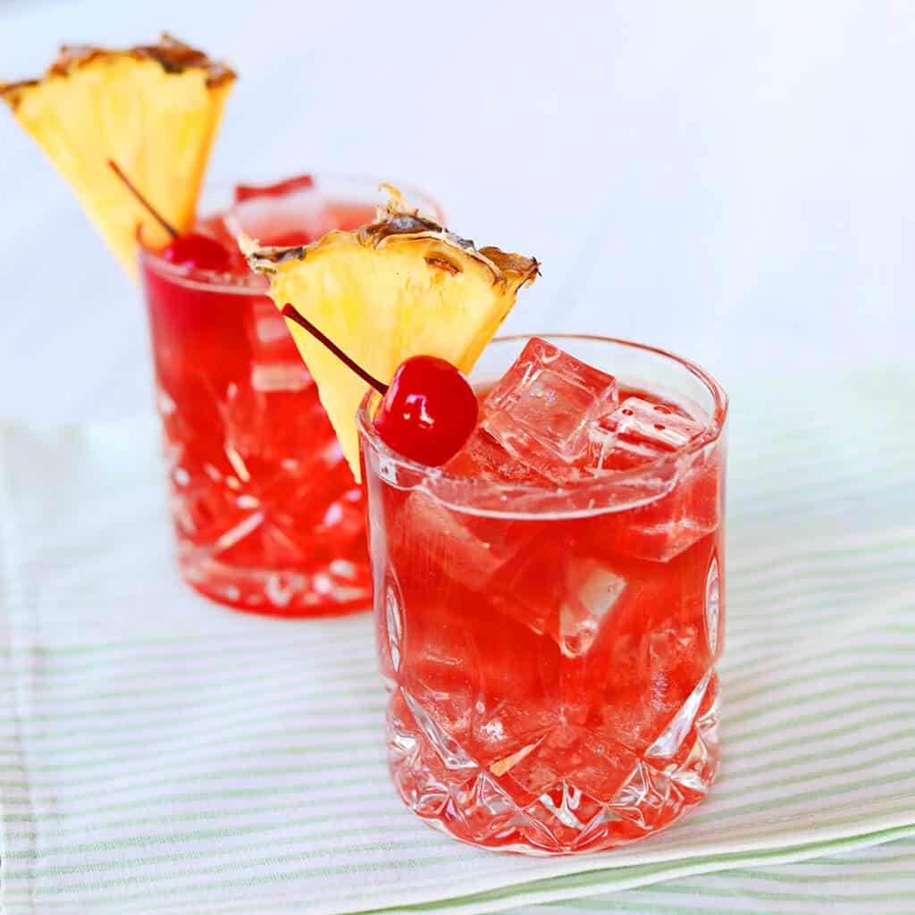 Triple Tiki Punch is rum-based cocktail made with three kinds of juices: pineapple, orange, and grapefruit. This drink can be served in a pitcher for a party and is extra fun to garnish.