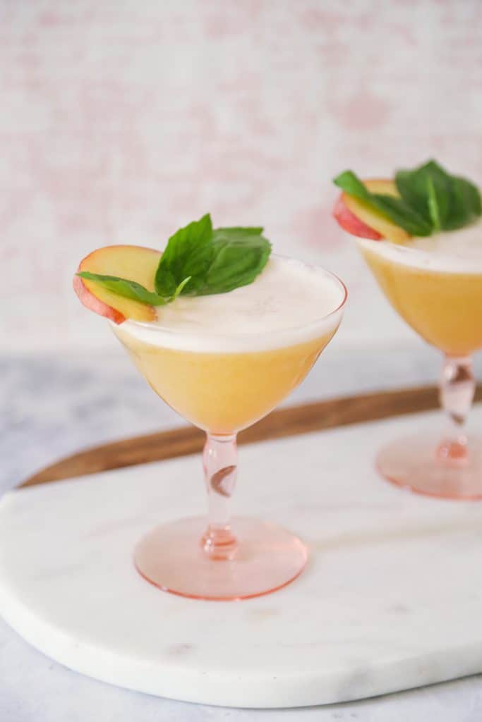 Our peach and basil whiskey sour is so refreshing and perfect for summer. This cocktail includes ingredients like muddled fresh peaches and basil for a fruity and herbal twist.