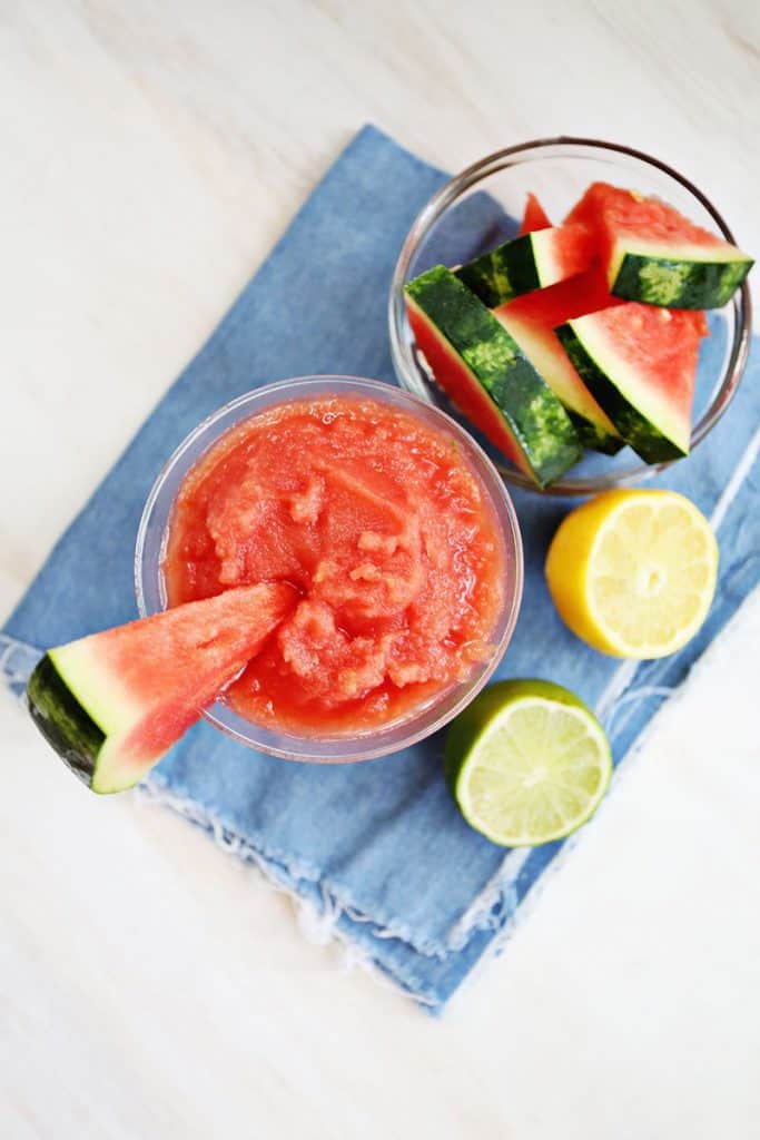 We used fresh watermelon juice (only two ingredients) and our homemade margarita mix to make the perfect summer cocktail—a juicy watermelon margarita with a salted rim.