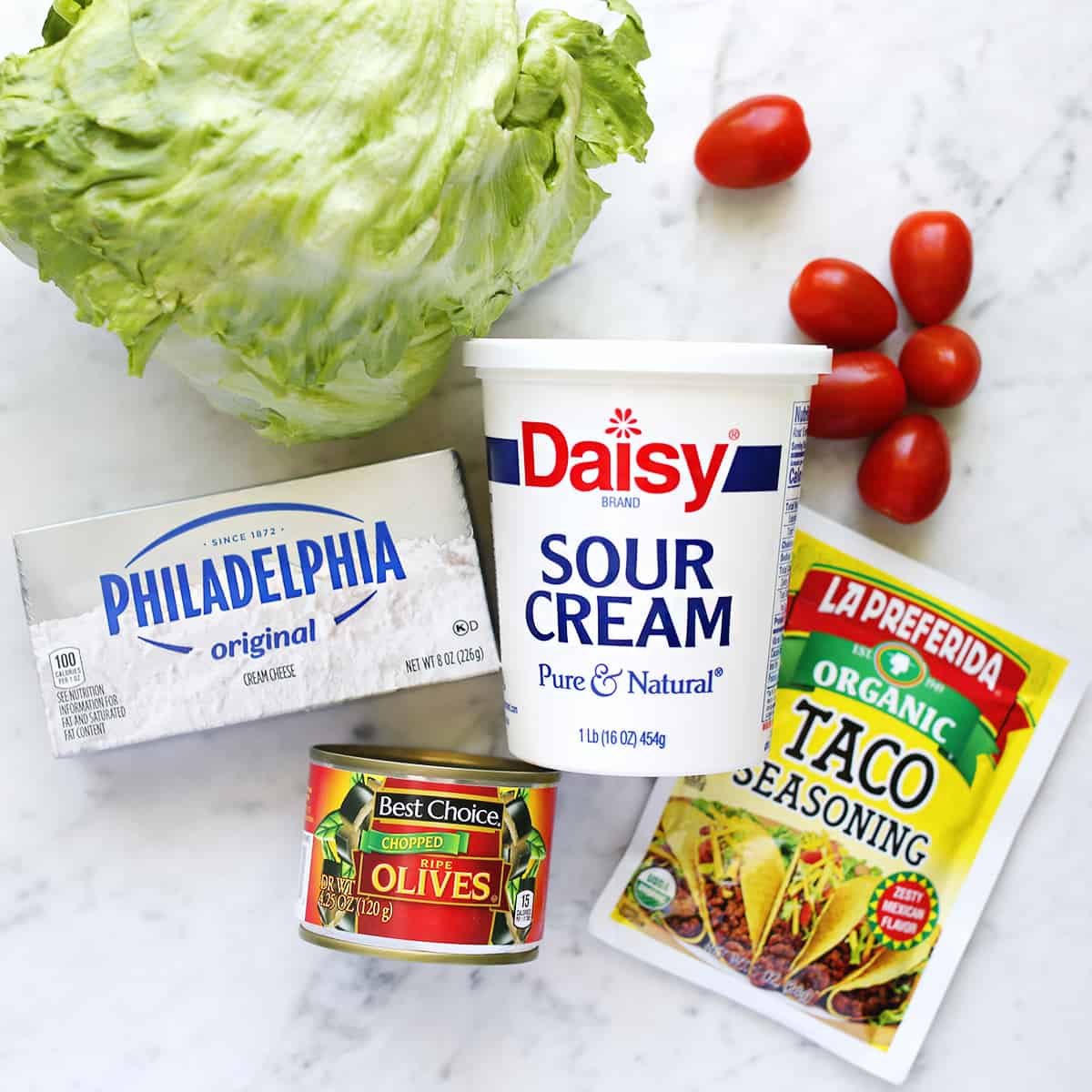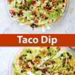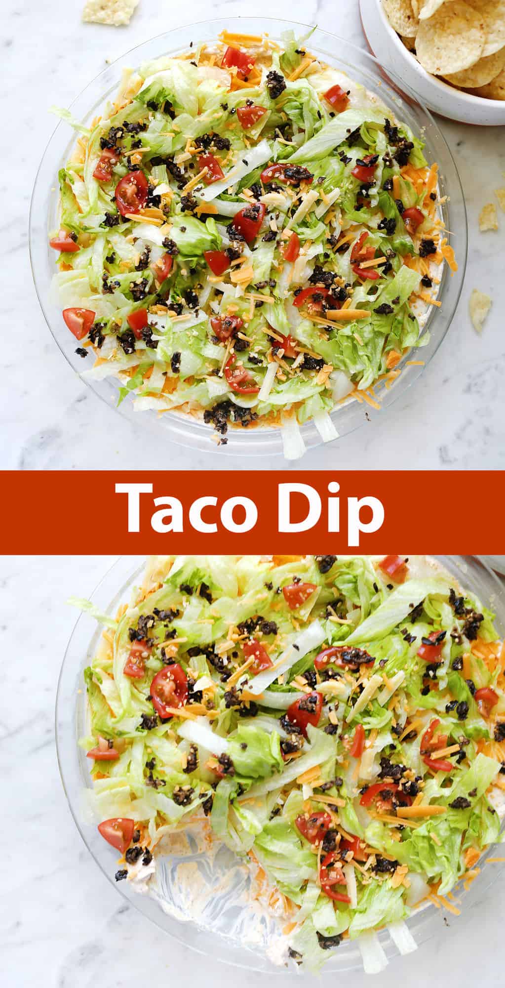 Taco dip is made of three basic ingredients (cream cheese, sour cream, taco seasoning), but then gets dressed up with any and all toppings you might put on a taco.