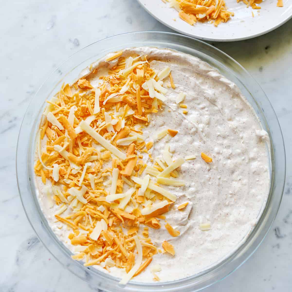 Spread this mixture into a pie pan or 8×8 square baking dish. Other serving dishes can work too, but the amount this recipe makes fit well in these sized dishes, so keep that in mind.