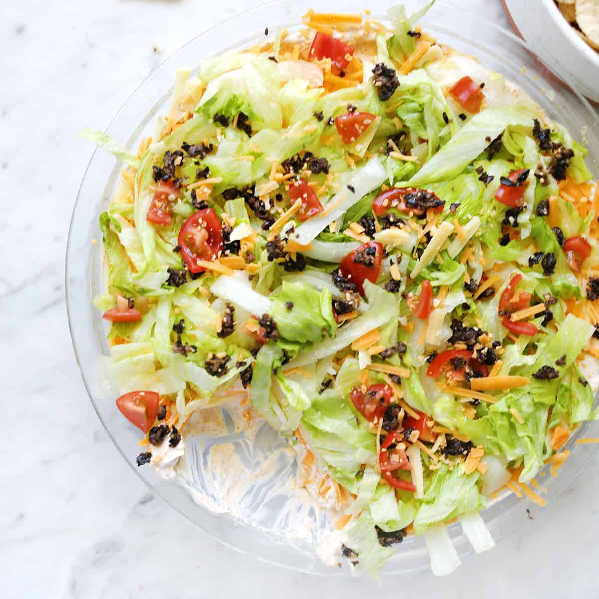Top with the cheese, lettuce, tomatoes, olives, and any other ingredients you may be using. Serve chilled with chips.
