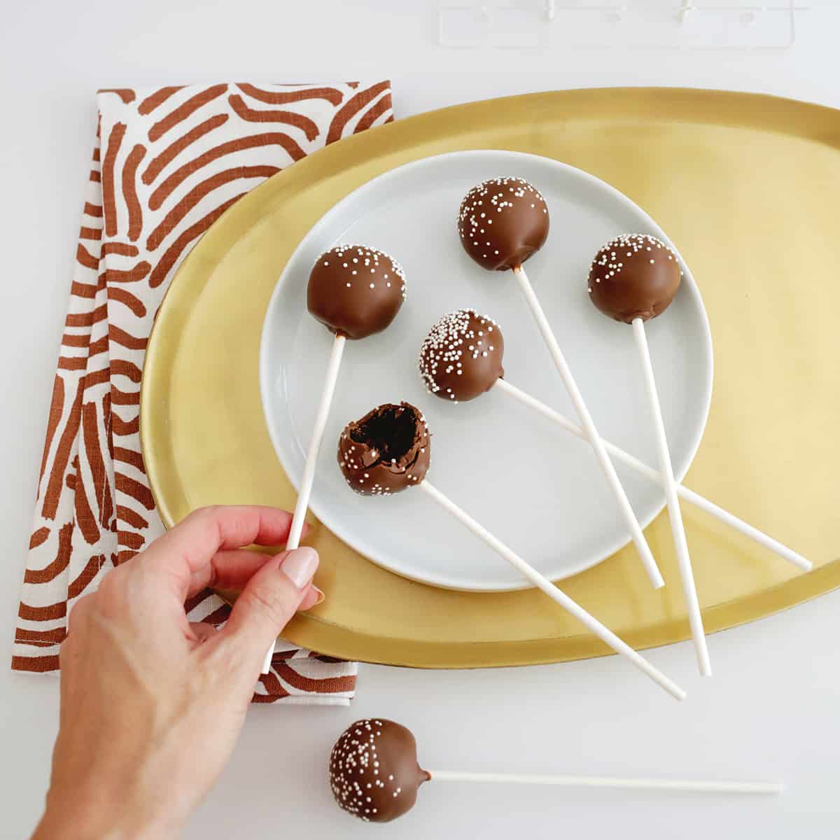 - Attach the cake pop stick: First, put your stick into the melted chocolate and push the stick 2/3 through a cold cake pop.