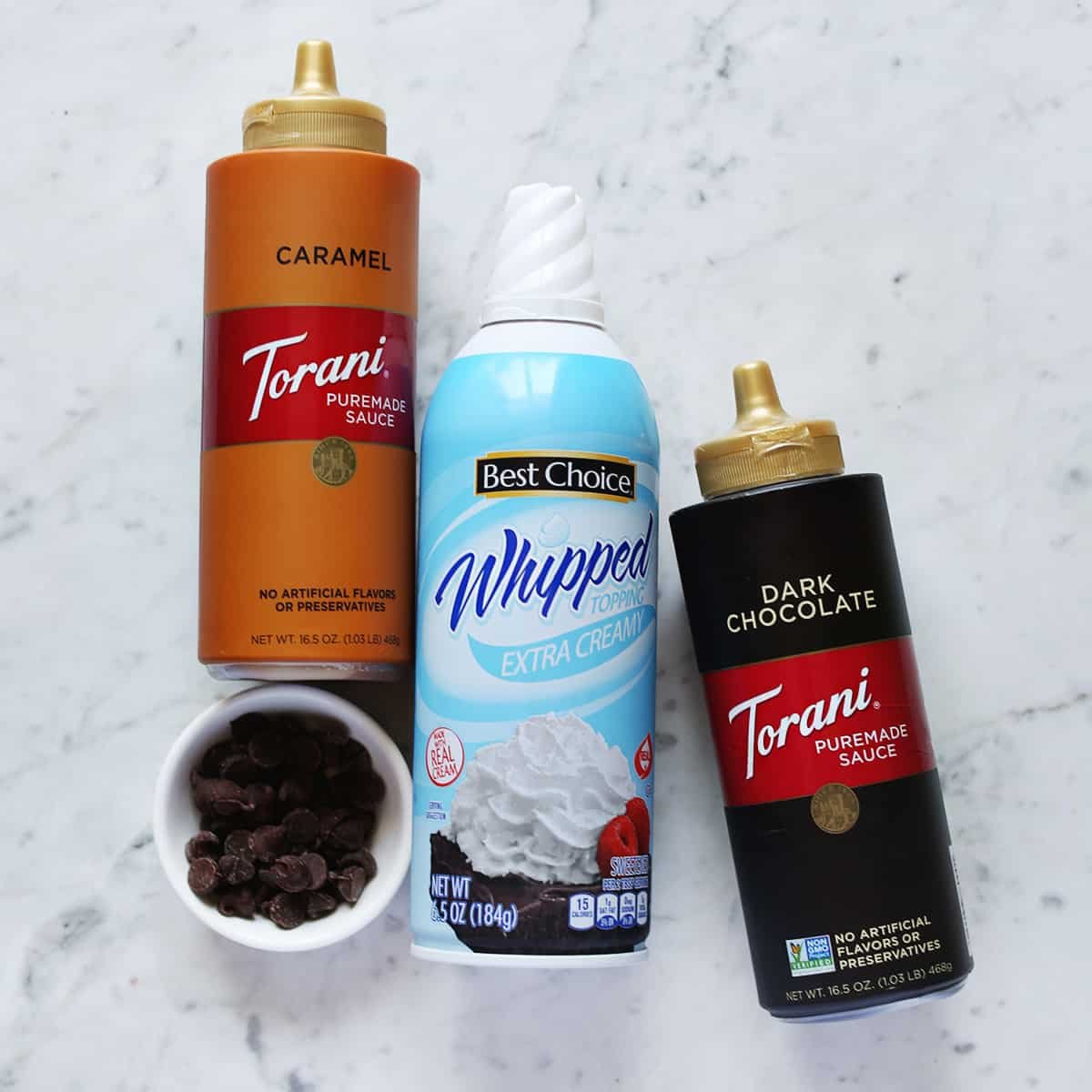 - Sweetener – chocolate syrup, caramel, chocolate chips, etc.