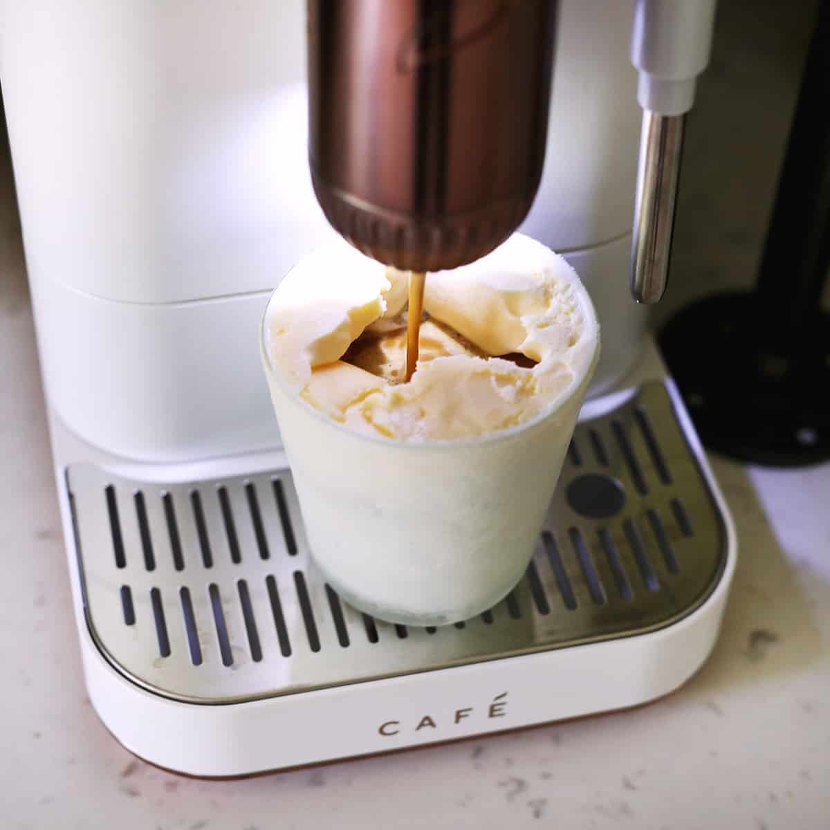 - I like to freeze ice cream in these small milk glasses I thrifted. I have a set of four and I will freeze the ice cream so it goes up the sides of the glass and leaves a hole in the center for the espresso shot to be added. I keep these in my freezer so I can make an affogato anytime I want. You could also make these cups ahead for a dinner party and then all you need to do is add the espresso shots, and I make them to serve.
