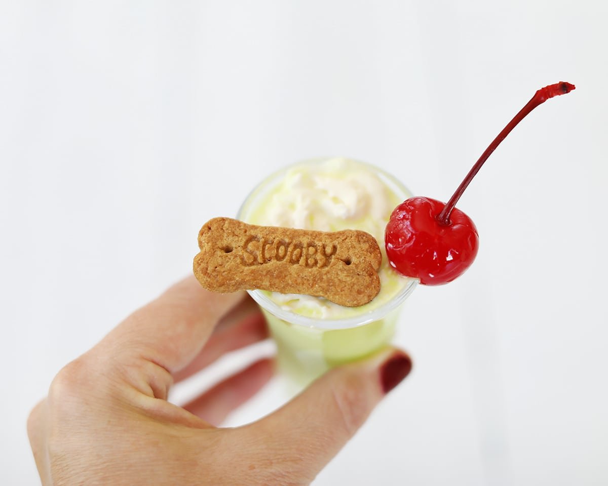 - Pour into a shot glass and garnish with whipped cream, a maraschino cherry or a Scooby Snack cookie. Serve immediately.
