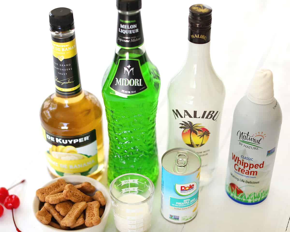 This recipe includes coconut rum, banana liqueur, melon liqueur, pineapple juice and heavy cream.