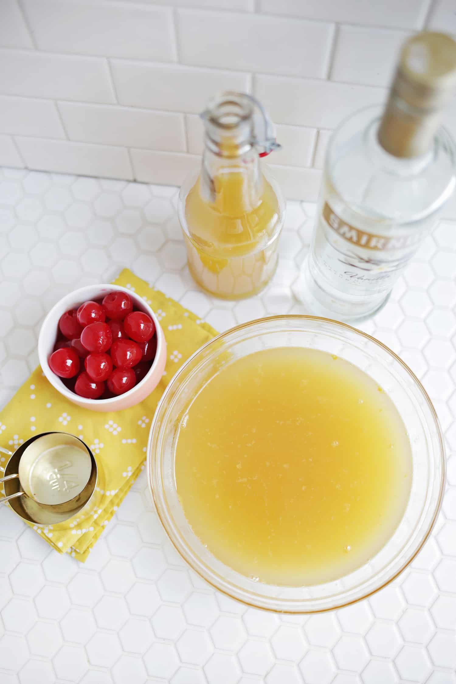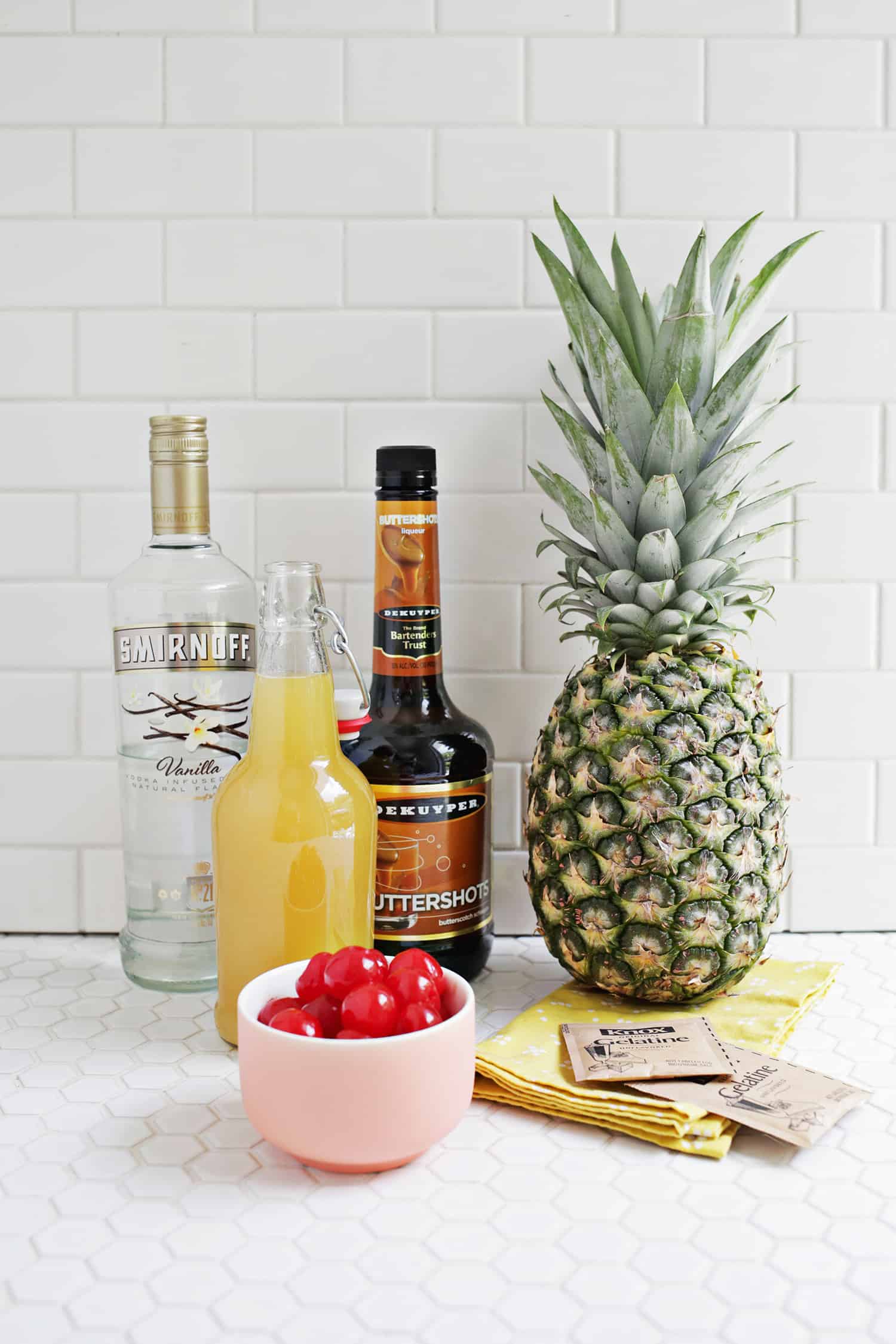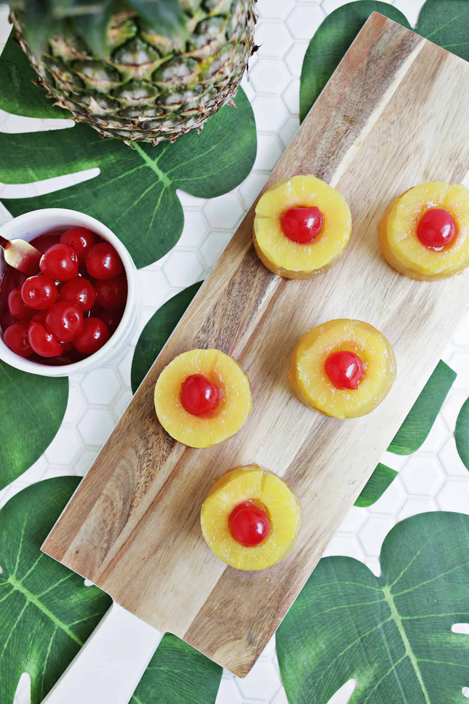 One of my favorite things to do is to make fun jello shots and I’ve got a great one for you today! I was thinking how pretty the top (or technically the bottom) of a pineapple upside down cake is and it dawned on me that it would be the perfect method and flavors for a jello shot, too.