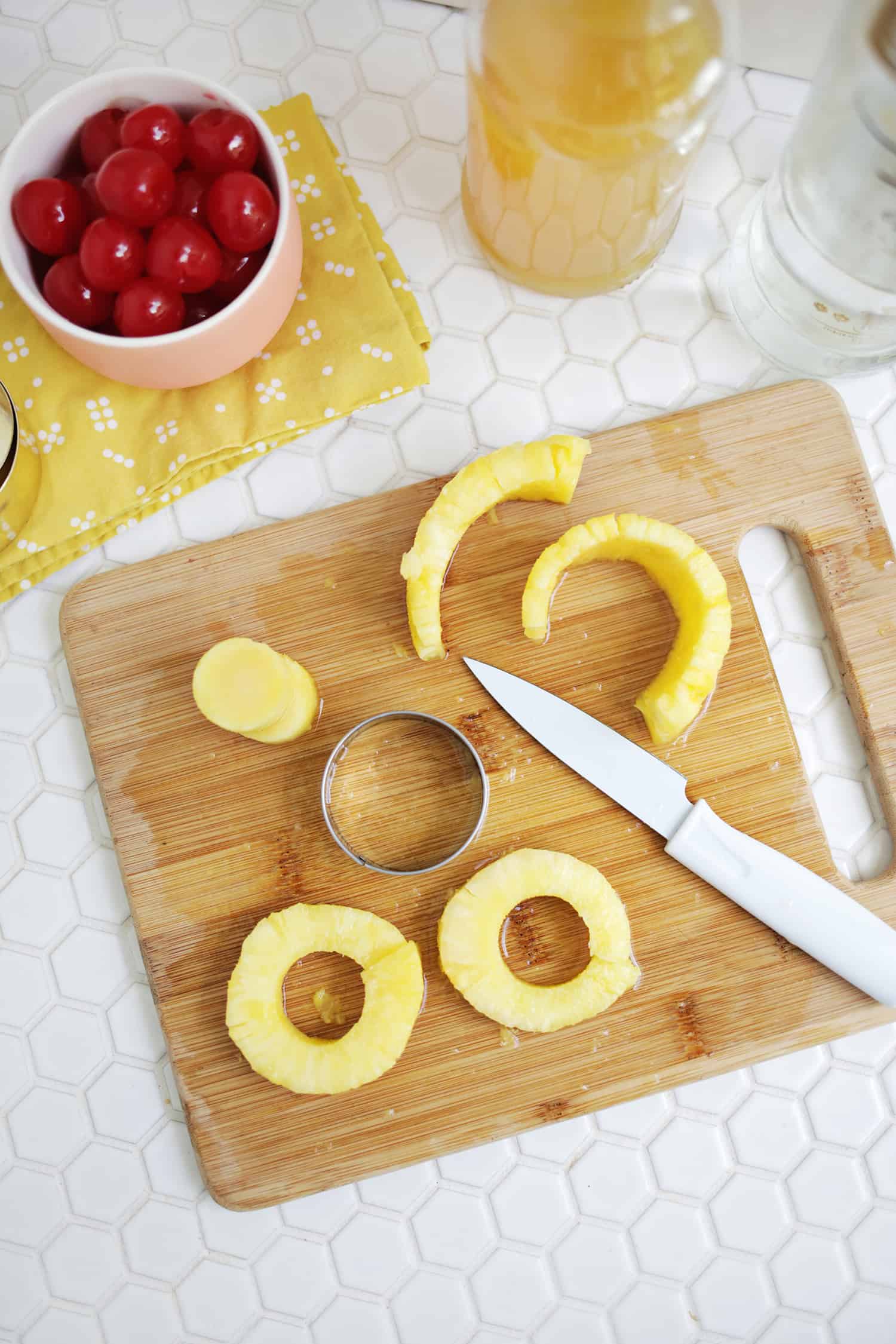 Cut a smaller circle in the middle of the pineapple for the cherry (or you can use circle cutters too) and bake your pineapple slices for 3 minutes in the microwave (or cook them for a few minutes in the oven).