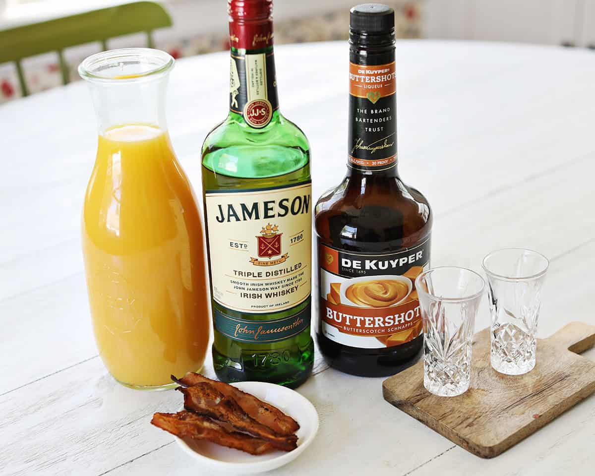 A Breakfast Shot is made using Irish whiskey, butterscotch schnapps, orange juice and bacon.