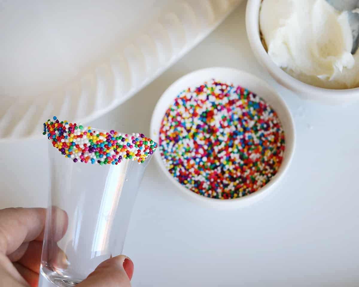 Begin by prepping the rim of your shot glasses. Smear a little icing on the outer edge around half of each glass. Next, roll the iced part into sprinkles until they are completely covered.