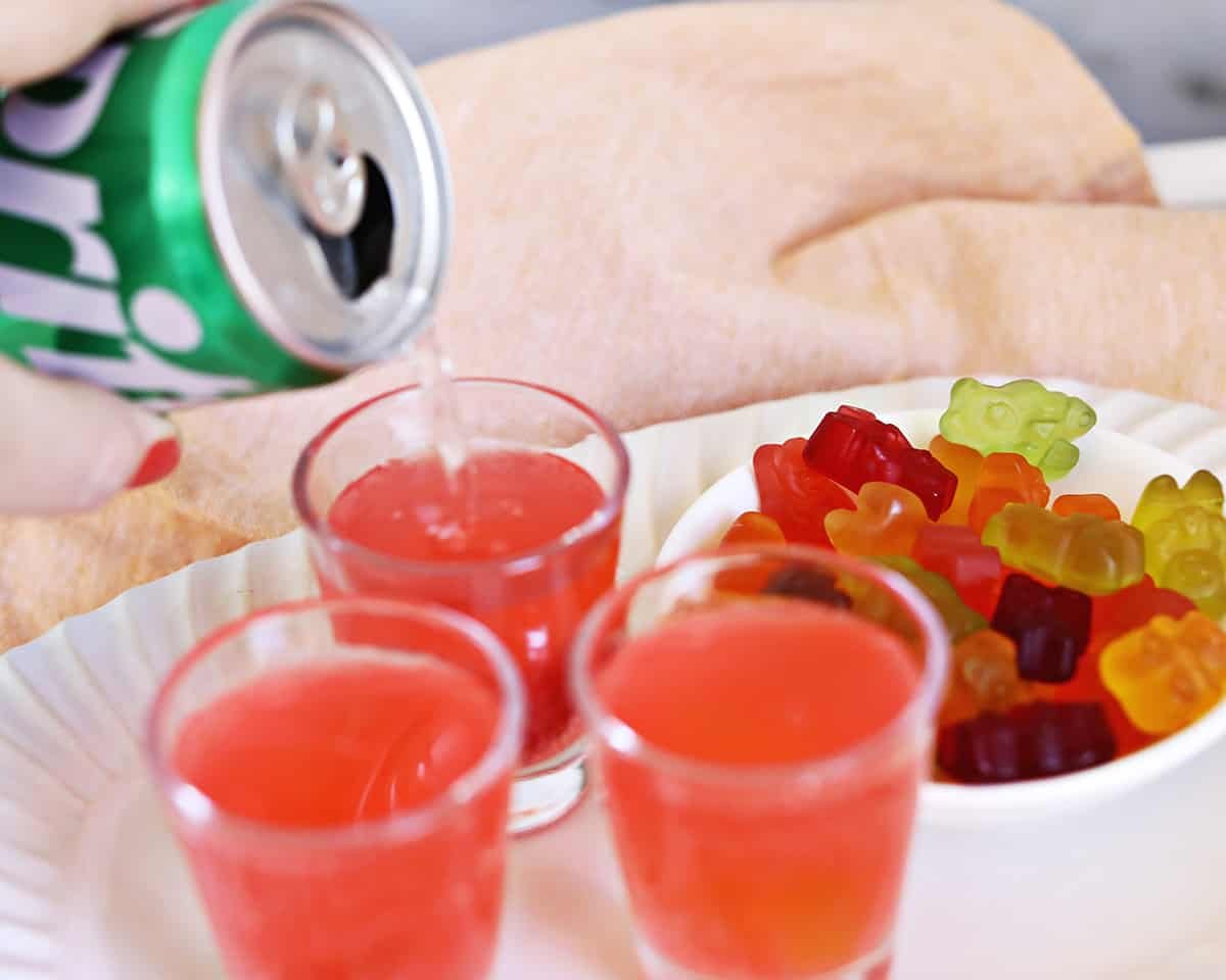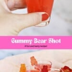 - Add a gummy bear for garnish. I added one to the edge of each glass (cut a slit in the bottom using a knife). You can also add gummy bears to the inside of your shot if you wish—it’s totally optional.