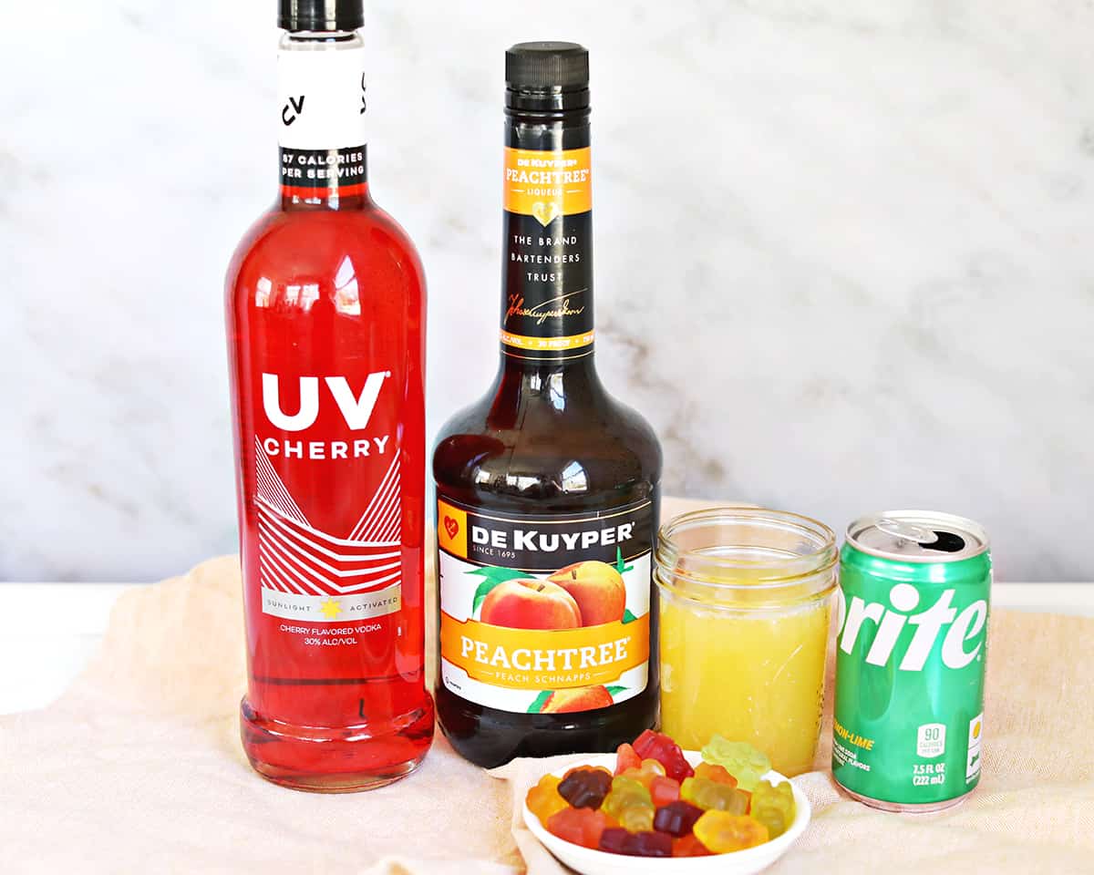 Cherry vodka, peach schnapps, pineapple juice and lemon-lime soda. They taste just like a red gummy bear!