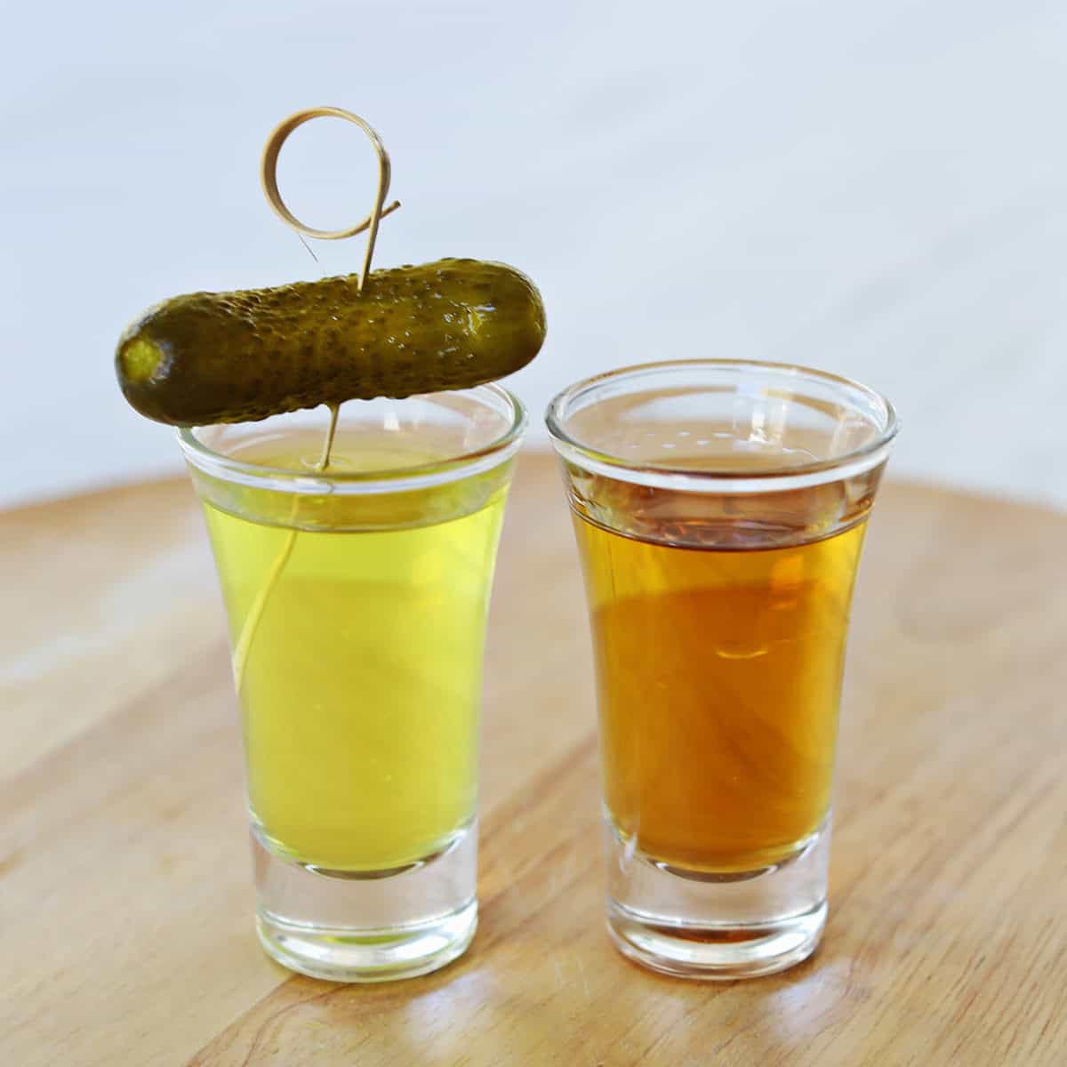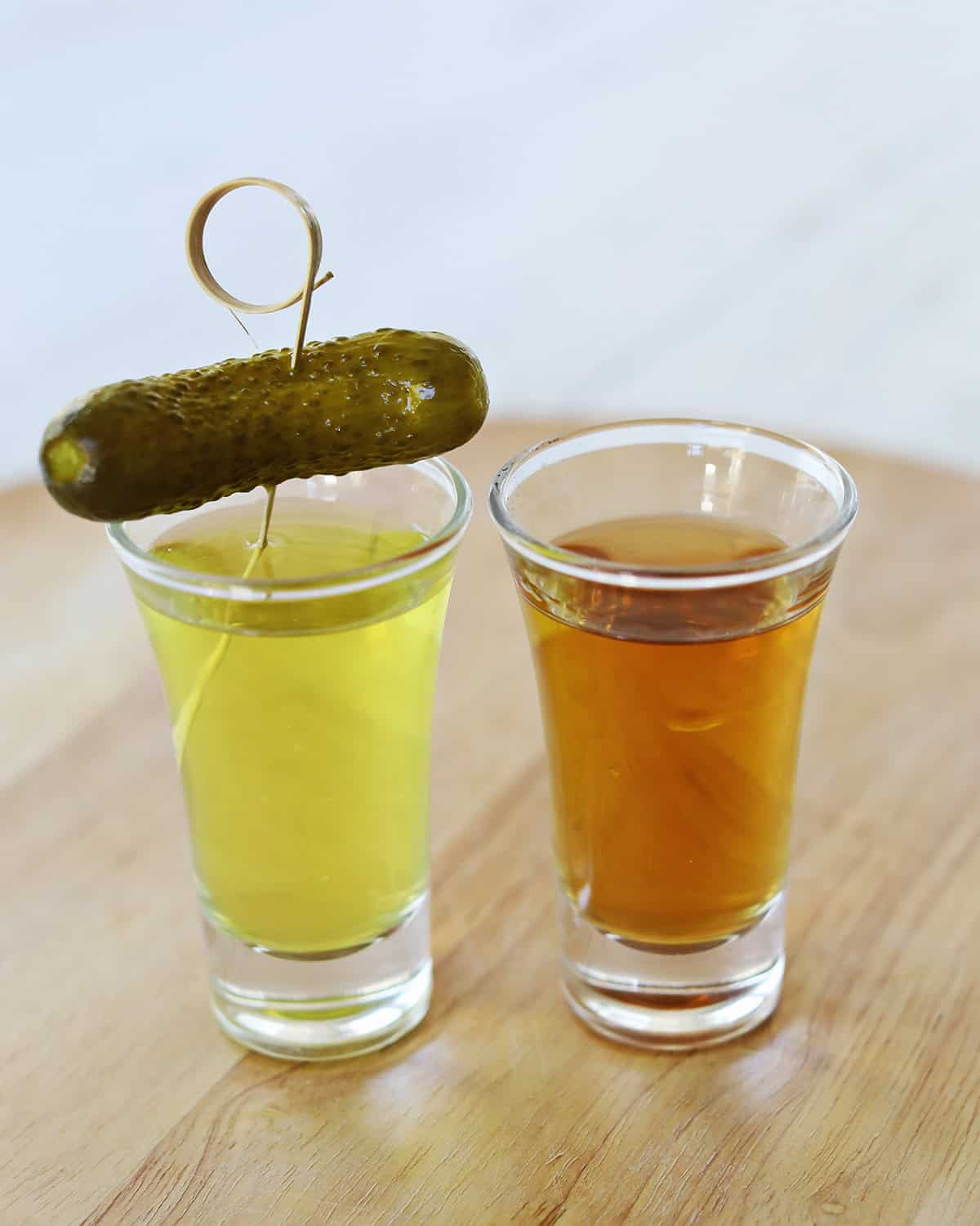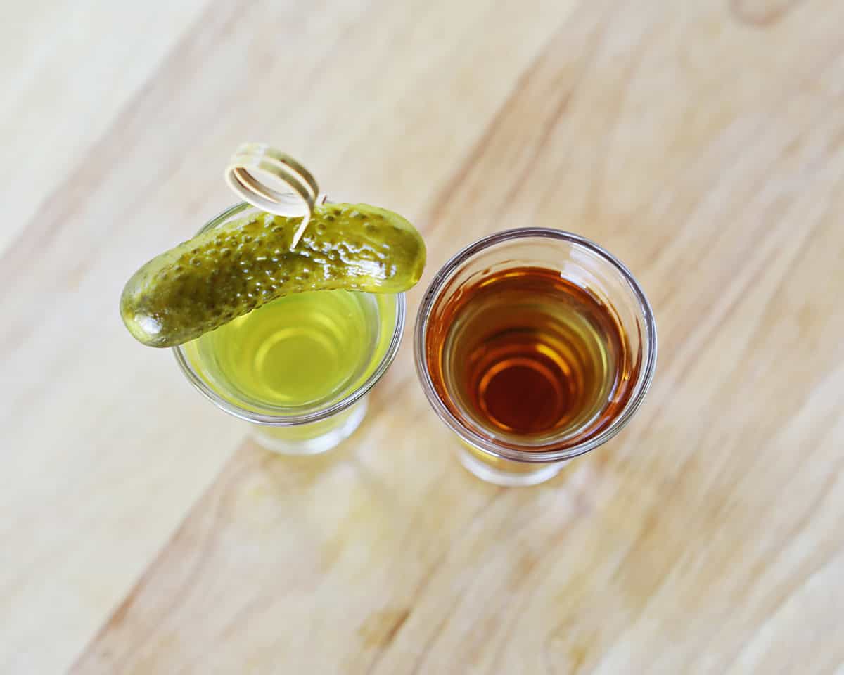 To serve, drink the whiskey shot first and then chase it with the pickle juice shot.