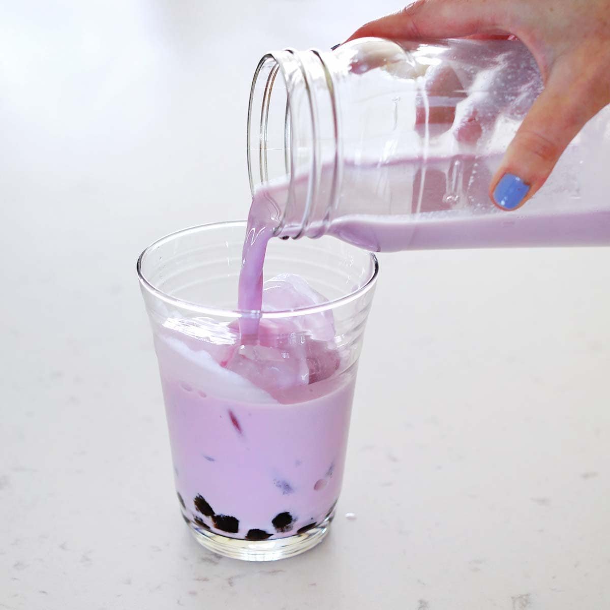 In a cup, add the boba pearls and then ice. Pour in your tea. Then pour in the taro milk. Taste and stir in more sweetener if you feel it needs it.