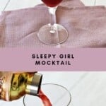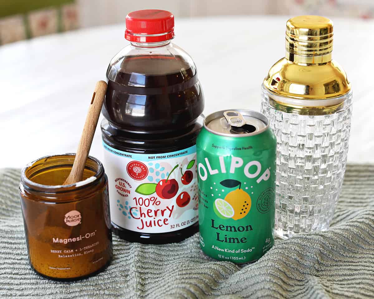 The ingredients in a Sleepy Girl Mocktail are tart cherry juice, magnesium powder and unflavored or prebiotic soda (such as Olipop).