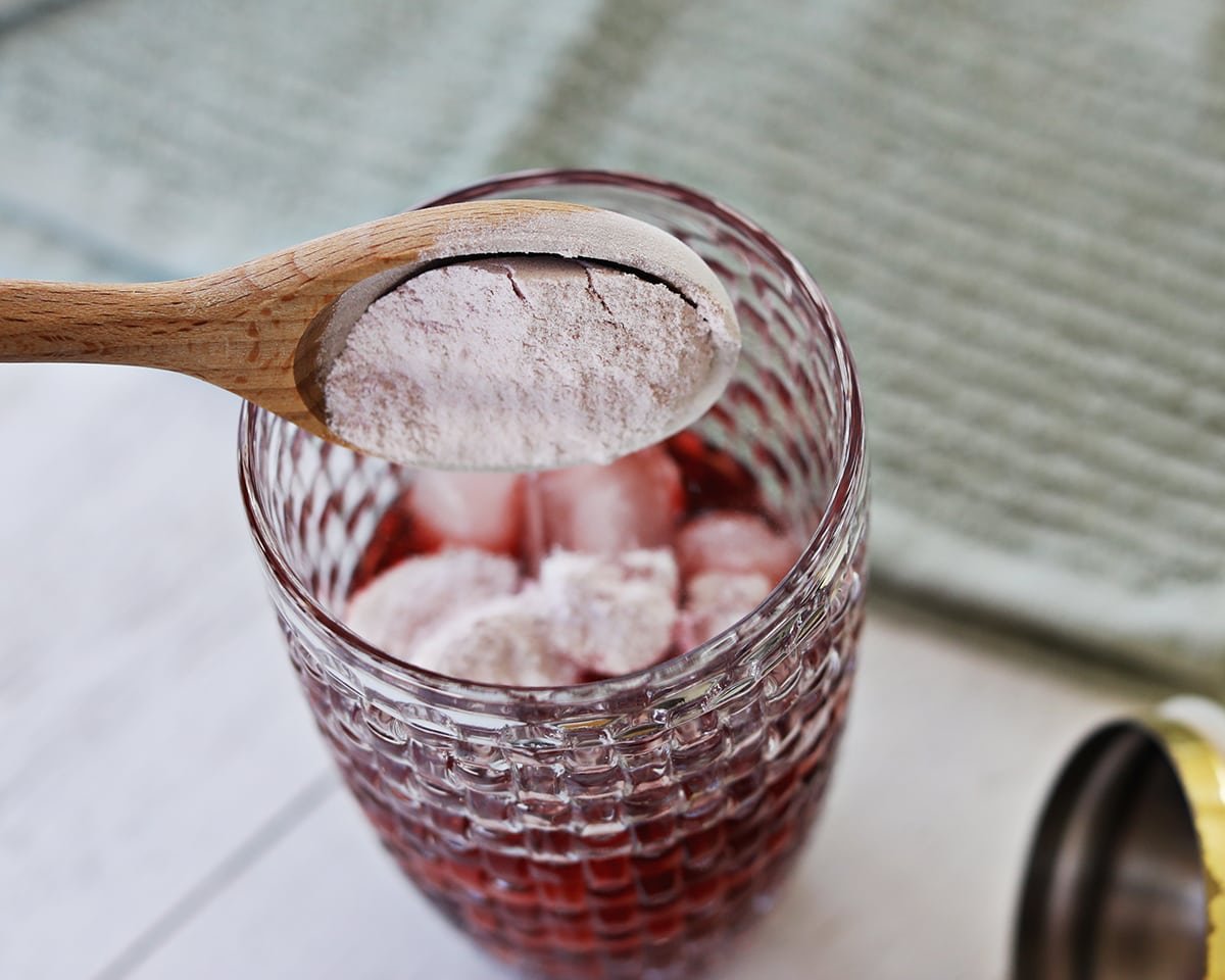 - In a cocktail glass, combine ice, cherry juice and magnesium powder.