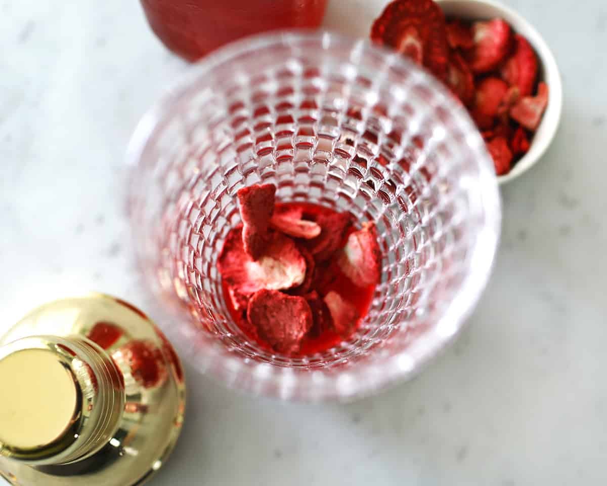 Shake the drink until it is fully mixed and pour it over ice. Garnish with a few more pieces of freeze dried strawberry on top.