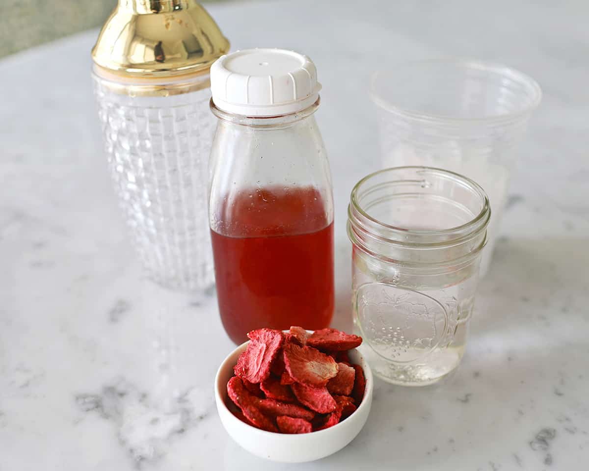 - In a shaker, combine some freeze dried strawberries (set aside a few to use as a topper at the end), about half a cup of the base, and half a cup of water with ice. Shake the drink until it is fully mixed and pour it over ice. Garnish with a few more pieces of freeze dried strawberry on top.