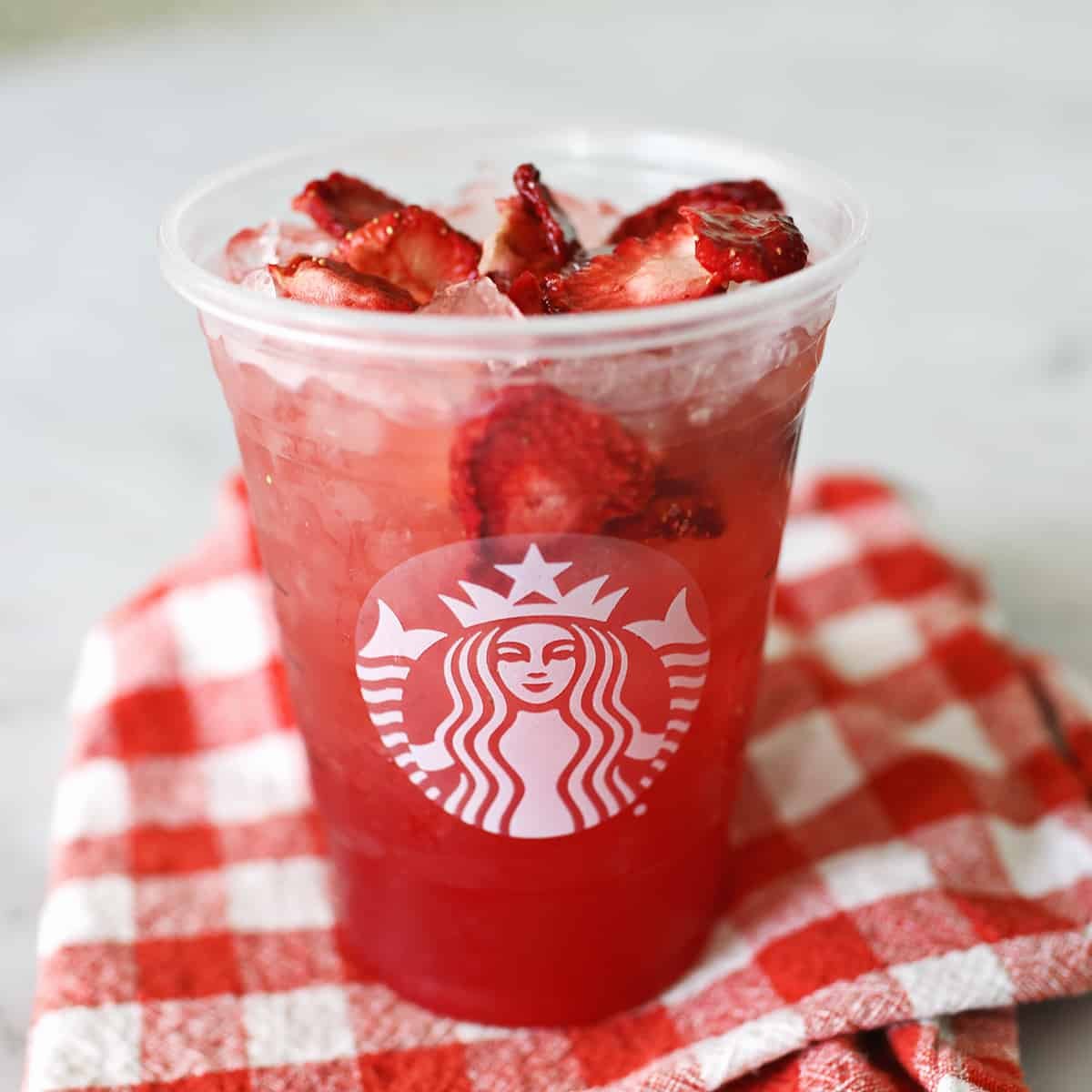 - Freeze Dried Strawberries – These freeze dried strawberries are a big part of the recipe, as they give the drink that fun sensory experience of having dried fruit bits in the drink. It’s my favorite thing about the refresher recipes!