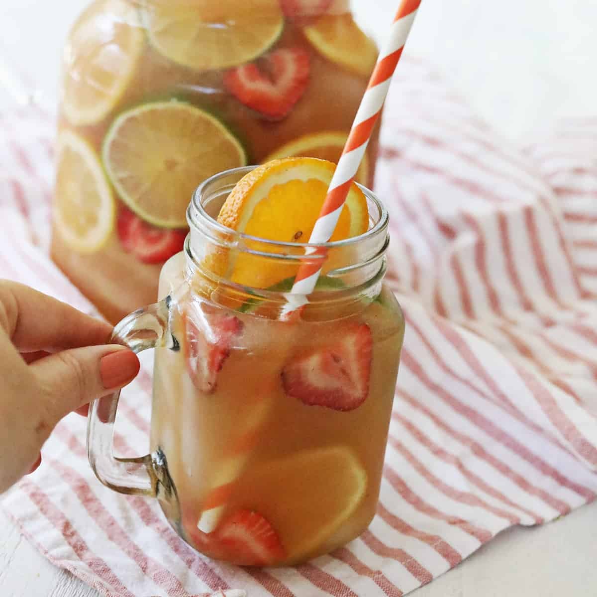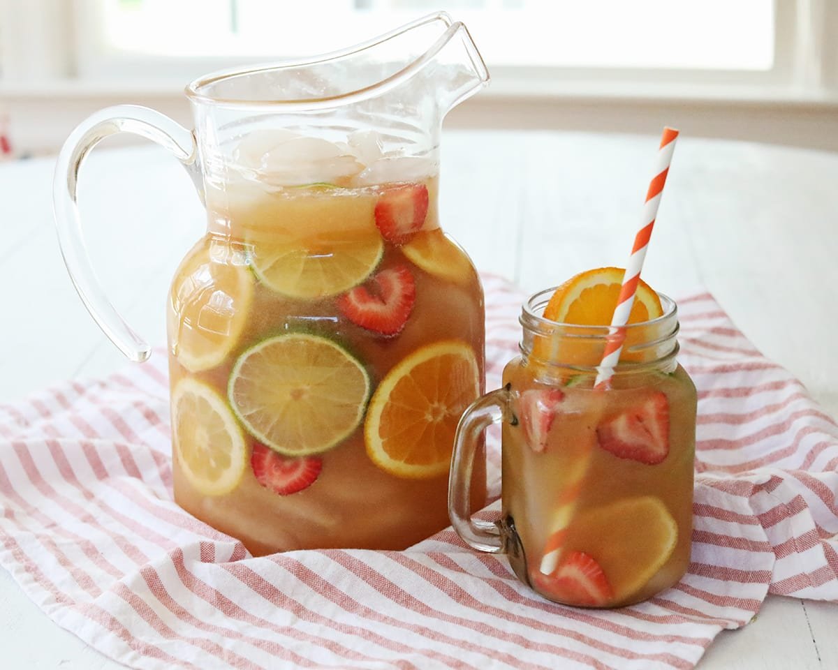 I love a refreshing drink like homemade fruit punch! Even though I consider myself a cocktail queen, I love to serve an array of beverages without alcohol at my gatherings. This homemade fruit punch recipe is easy to create in just five minutes. It’s perfect for your next celebration!