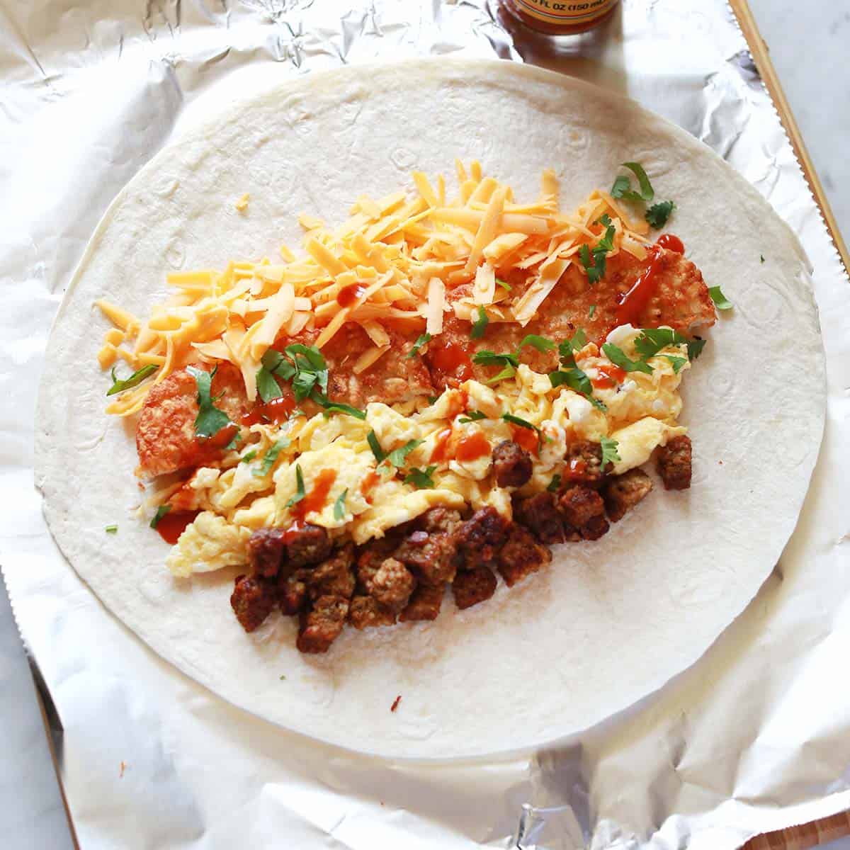- Place a warm tortilla shell over a large square of aluminum foil. Add the ingredients: hash brown patty, scrambled eggs, sausage, shredded cheese, chopped cilantro and a little hot sauce (optional). Roll into a burrito and then wrap in the aluminum foil. Repeat as needed.
