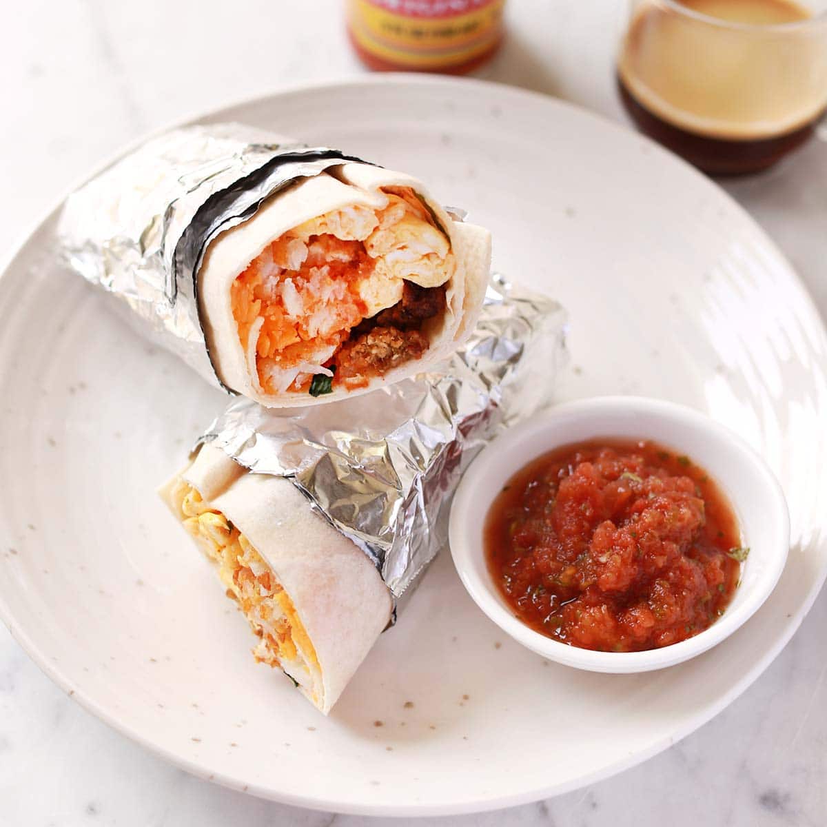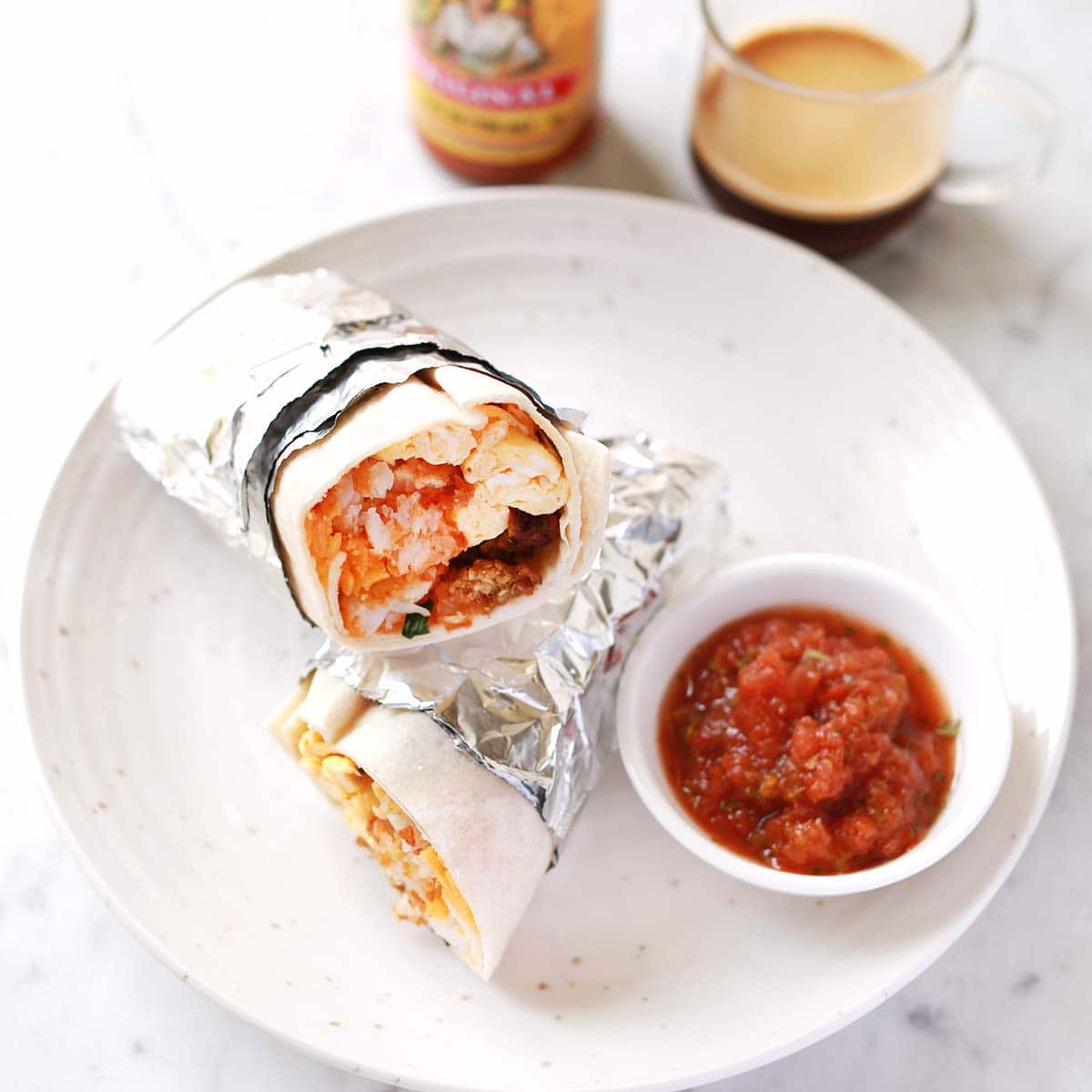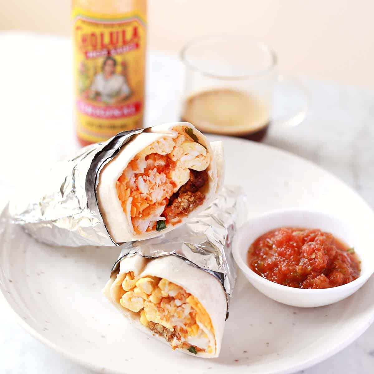I also like to add cilantro and a little hot sauce inside the breakfast burrito, but this is up to you. I typically serve salsa on the side, rather than inside the burrito as it can make it soggy.
