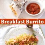 Once the cheese is melted tear the foil away and enjoy your breakfast burrito. Serve alongside some salsa, sour cream, etc.