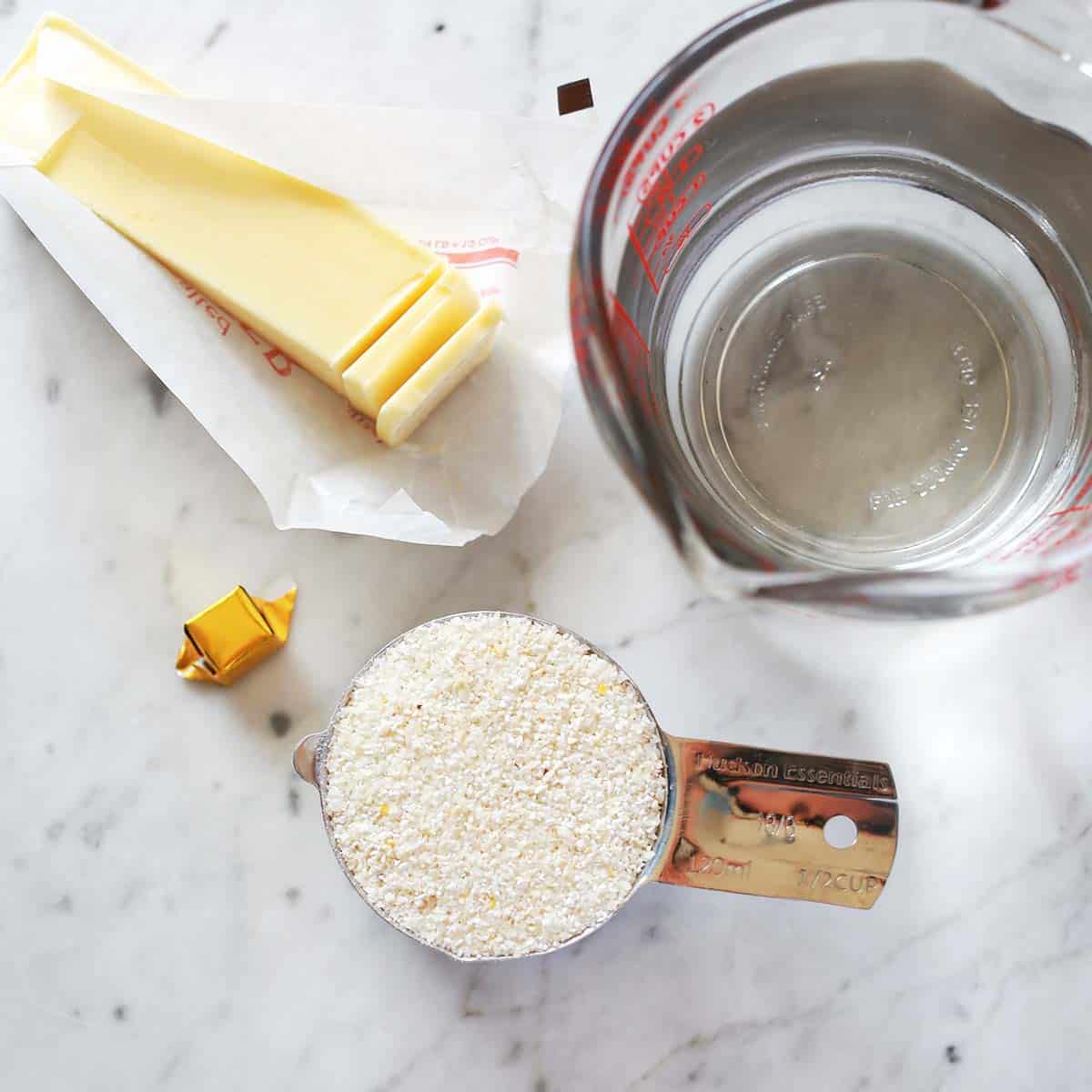 - Grits are made with a 4:1 ratio of water (or stock) to grits. In the recipe card here I’ve listed 2 cups of water to 1/2 cup of grits (in order to make two servings). You can cut this in half, double it, etc. Just use the 4:1 ratio as your guide.