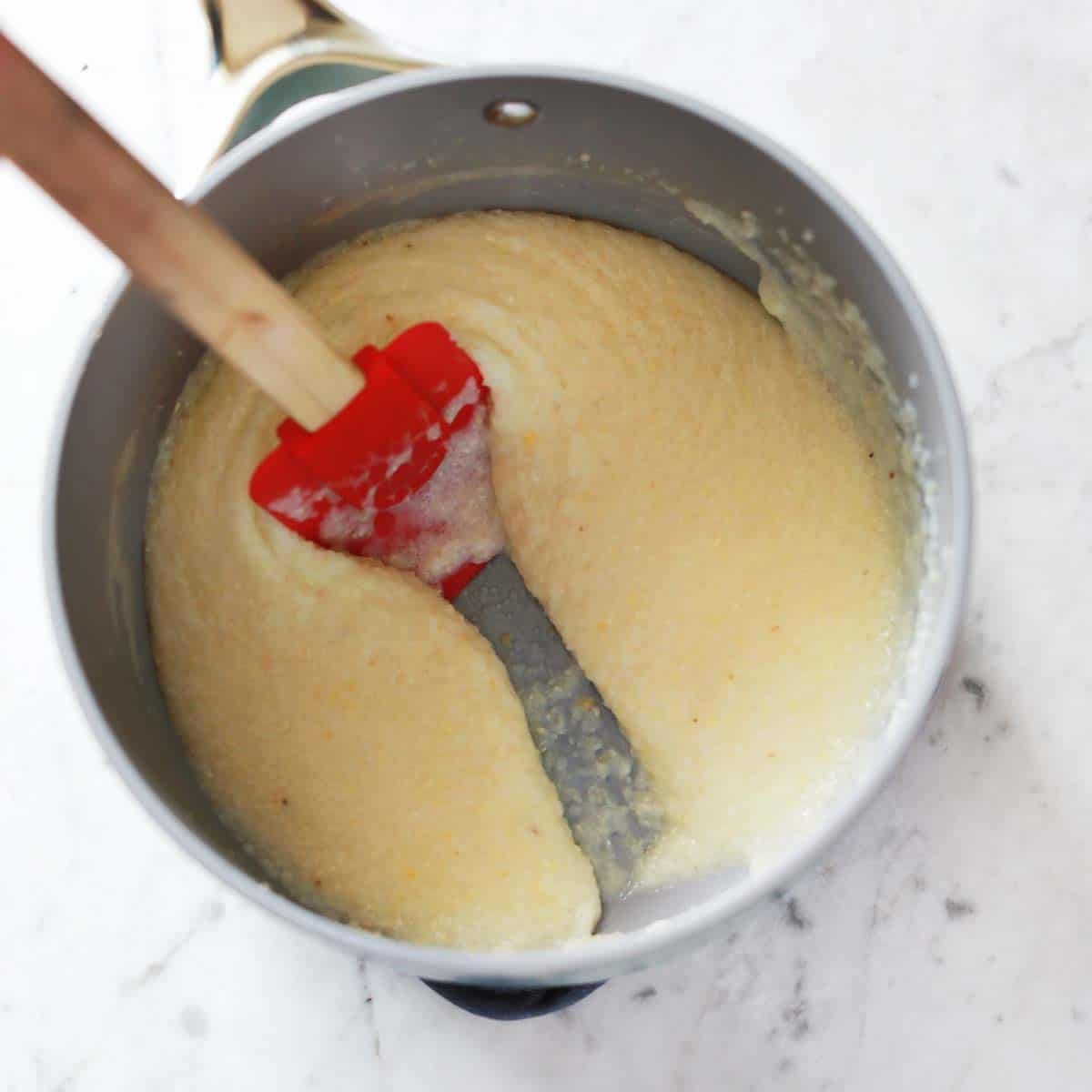 - While whisking, stir in the grits and continue to cook on medium/high heat for 12-14 minutes. Stir occasionally so the grits do not stick to the bottom of the pan.