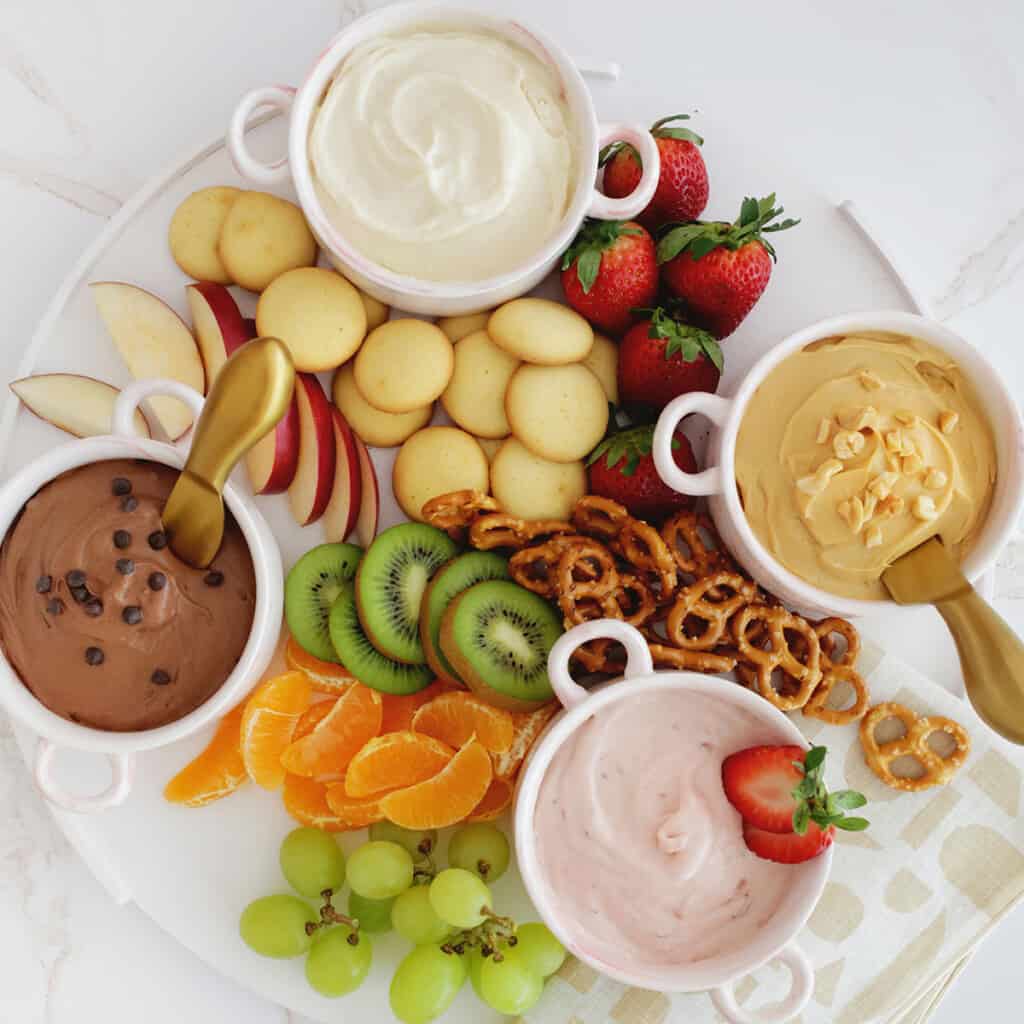 It only takes five minutes to make an easy vanilla, strawberry, chocolate, or caramel cream cheese fruit dip—perfect for any party! Serve with fruit, pretzels, cookies and berries.