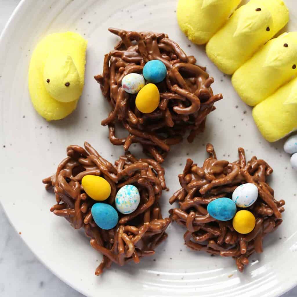 These classic bird’s nest cookies are a dessert I most often associate with Easter, but it’s a fun one for anytime in the spring to celebrate the changing of the seasons. If you’ve never had bird’s nest cookies before, they are crunchy chocolate and peanut butter no-bake treats that get topped with candy eggs.