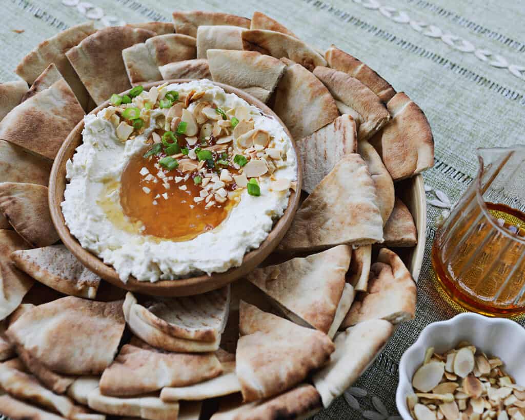 Whipped feta dip with honey and pita bread. This fancy dip recipe is perfect for a family brunch or lunch.