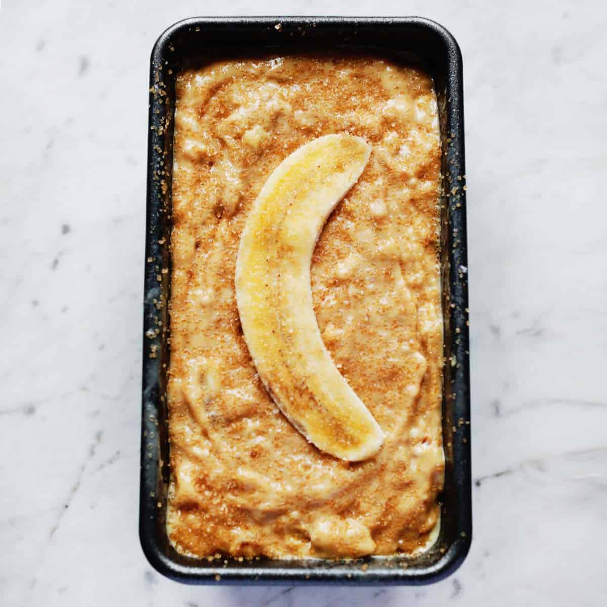 - Spoon the batter into the prepared loaf pan and top with turbinado sugar if using.