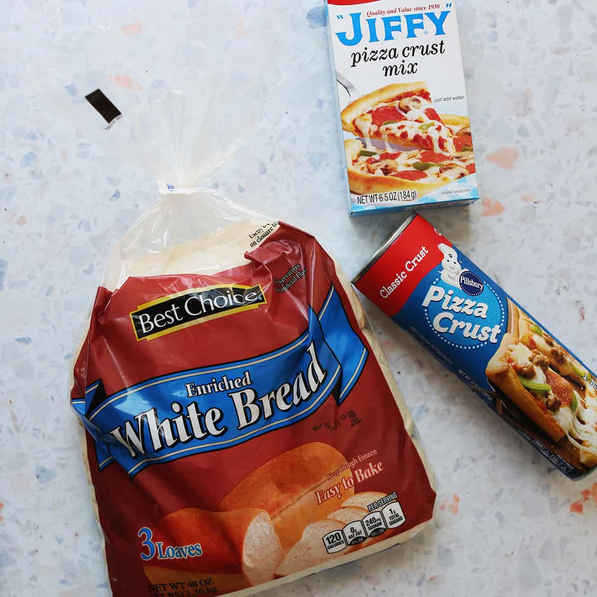 - Frozen dough for bread loaves – This is my favorite store-bought option. Each loaf will make three calzones, so this entire package you see above would make nine calzones if I used it all at once. You will need to thaw and roll this dough out with a rolling pin.